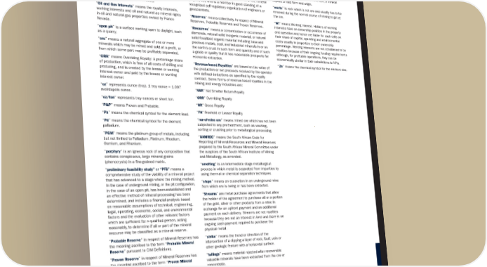 “ NPR ” means Net Proceeds Royalties: which is a royalty on the profits after deduction of expenses. “ NRI ” means Net Royalty Interest: paid net of operating and capital costs (similar to an NPI). “ NSR ” means Net Smelter Return: Which is the proceeds returned from the smelter and/or refinery to the mine owner less certain costs. “ Oil and Gas Interests ” means the royalty interests, working interests and oil and natural as mineral rights in oil and natural gas properties owned by Franco- Nevada. “ open pit ” is a surface working open to daylight, such as a quarry. “ ore ” means a natural aggregate of one or more minerals which may be mined and sold at a profit, or from which some part may be profitably separated. “ ORR ” means Overriding Royalty: A percentage share of production, which is free of all costs of drilling and producing, and is created by the lessee or working interest owner and paid by the lessee or working interest owner. “ oz ” represents ounce (troy). 1 troy ounce = 1.097 avoirdupois ounce. “ oz/ton ” represents troy ounces er short ton. “ P&P ” means Proven and Probable. “ Pb ” means the chemical symbol for the element lead. “ Pd ” means the chemical symbol for the element palladium. “ PGM ” means the platinum group of metals, including but not limited to Palladium, Platinum, Rhodium, Osmium, and Rhenium. “ porphyry ” is an igneous rock of any composition that contains conspicuous, large mineral grains (phenocrysts) in a fine-grained matrix. “ preliminary feasibility study” or “PFS” means a comprehensive study of the viability of a mineral project that has advanced to a stage where the mining method, in the case of underground mining, or the pit configuration, in the case of an open pit, has been established and an effective method of mineral processing has been determined, and includes a financial analysis based on reasonable assumptions of technical, engineering, legal, operating, economic, social, and environmental factors and the evaluation of other relevant factors which are sufficient for a qualified person, acting reasonably, to determine if all or part of the mineral resource may be classified as a mineral reserve. “ Probable Reserve ” in respect of Mineral Reserves has the meaning ascribed to the term “ Probable Mineral Reserve ” pursuant to CIM Definitions. “ Proven Reserve ” in respect of Mineral Reserves has the meaning ascribed to the term “ Proven Mineral Reserve ” pursuant to CIM Definitions. “ Pt ” means the chemical symbol for the element platinum. “ tpa ” means tonnes per annum. “ vein ” means an epigenetic mineral filling of a fault or other fracture, in tabular or sheet-like form, often with associated replacement of the host rock; a mineral deposit of this form and origin. “ waste ” is rock which is not ore and usually has to be removed during the normal course of mining to get at the ore. “ WI ” means Working Interest. Holders of working interests have an ownership position in the property and operation and hence are liable for cash calls on their share of capital, operating and environmental costs usually in proportion to their ownership percentage. Working interests are not considered to be royalties because of their ongoing funding requirements although, for profitable operations, they can be economically similar in their calculations to NPIs. “ Zn ” means the chemical symbol for the element zinc. “ Qualified Person ” for the purposes of NI 43-101, is an individual who is an engineer or geoscientist with at least five years of experience in mineral exploration, mine development or operation or mineral project assessment, or any combination of these; and has experience relevant to the subject matter of the mineral project; and who is a member in good standing of a recognized self-regulatory organization of engineers or geoscientists. “ Reserves ” means collectively, in respect of Mineral Reserves, Probable Reserves and Proven Reserves. “ Resources ” means a concentration or occurrence of diamonds, natural solid inorganic material, or natural solid fossilized organic material including base and precious metals, coal, and industrial minerals in or on the earth’s crust in such form and quantity and of such a grade or quality that it has reasonable prospects for economic extraction. “ Revenue-based Royalties ” are based on the value of the production or net proceeds received by the operator with defined deductions as specified by the royalty contract. Some forms of revenue-based royalties in the mining and energy industries are: “ NSR ” Net Smelter Return Royalty “ ORR ” Overriding Royalty “ GR ” Gross Royalty “ FH ” Freehold or Lessor Royalty “ run-of-mine ore ” means mined ore which has not been subjected to any pre-treatment, such as washing, sorting or crushing prior to metallurgical processing. “ SAMREC ” means the South African Code for Reporting of Mineral Resources and Mineral Reserves prepared by the South African Mineral Committee under the auspices of the South African Institute of Mining and Metallurgy, as amended. “ smelting ” is an intermediate stage metallurgical process in which metal is separated from impurities by using thermal or chemical separation techniques. “ stope ” means an excavation in an underground mine from which ore is being or has been extracted. “ Streams ” are metal purchase agreements that allow the holder of the agreement to purchase all or a portion of the gold, silver or other products from a mine in exchange for an upfront payment and an additional payment on each delivery. Streams are not royalties because they are not an interest in land and there is an ongoing cash payment required to purchase the physical metal. “ strike ” means the trend or direction of the intersection of a dipping a layer of rock, fault, vein or other geologic feature with a ho
