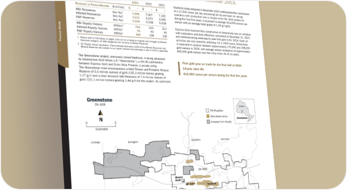 G R E E N S T O N E Location: Ontario, Canada | Operator: Equinox Gold Corp. / Orion Mine Finance | Precious Metals: Au | Royalty: NSR: 3% Franco-Nevada acquired a 3% NSR on Greenstone as part of its acquisition of a portfolio of approximately 20 royalties from Barrick in November 2013. 2023 2022 2021 Revenue to Franco-Nevada ($ million) $ − $ – $ – M&I Resources (koz Au) 1 7,008 7,007 7,105 Inferred Resources (koz Au) 1 3,072 3,072 3,095 P&P Reserves (koz Au) 1 5,539 5,538 5,538 M&I Royalty Ounces (000s) 1,2 210 210 213 Inferred Royalty Ounces (000s) 2 92 92 93 P&P Royalty Ounces (000s) 2 166 166 166 1 Please refer to the tables on pages 118-124 for a breakout of grade and tonnages by Mineral Resource category; all M&I categories are inclusive of Mineral Reserves 2 For Royalty Ounce calculation, Franco-Nevada estimates 100% of the Mineral Resources and Mineral Reserves are subject to our royalty interest and estimates a rate of 3.0% is applicable The Greenstone project, previously called Hardrock, is being advanced by Greenstone Gold Mines L.P . (“Greenstone”), a 60/40 partnership between Equinox Gold and Orion Mine Finance, a private entity. The Greenstone mine encompasses a total Proven and Probable Mineral Reserve of 5.5 million ounces of gold (135.3 million tonnes grading 1.27 g/t) and a total Inclusive M&I Resource of 7.0 million ounces of gold (151.1 million tonnes grading 1.44 g/t) for the project. An optimized feasibility study prepared in December 2020 contemplated the construction of a 27,000 tonne per day processing facility and open pit mining operation with production over a 14-year mine life. Gold production during the first five years is expected to average 414,000 ounces per annum with an average head grade of 1.45 g/t gold. Equinox Gold reported that construction at Greenstone was on schedule with installation activities effectively completed at December 31, 2023 and commissioning underway to pour first gold in H1 2024. Open pit activities are also currently underway. On a 100% basis, Greenstone is expected to produce between approximately 175,000 and 208,000 gold ounces in 2024, and average annual production of approximately 400,000 gold ounces over the initial mine life of 14 years. Salsberg Ashmore McKelvie Lindsey Parent Errington Ontario Greenstone Mosher Shaft SP Zone Hardrock Geraldton Other Royalty Claims Other Royalty Claims FNV Royalties Mineralized zones Excluded from Royalty Greenstone 3% NSR kilometer 3 0 N 3% NSR First gold pour on track for the first half of 2024 14-year mine life 414,000 ounce per annum during the first five years TSX / NYSE: FNV 66 ★ Franco-Nevada Corporation Canada