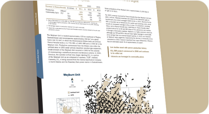 W E Y B U R N U N I T Location: Saskatchewan, Canada | Operator: Whitecap Resources Inc. | Energy: Oil | Royalty: NRI: 11.71% /ORR: 0.44% / WI: 2.56% Franco-Nevada, after Whitecap Resources Inc. (“Whitecap”), has the second largest economic interest in the Weyburn Unit, one of the world’s largest geological CO 2 storage projects. 2023 2022 2021 Revenue to Franco-Nevada ($ million) $ 50.1 $ 65.0 $ 43.8 Production (Mboe) 1 675 769 736 Commodity Split (%) 2 Oil 100% 100% 100% Gas 0% 0% 0% NGL 0% 0% 0% 1 Net to FNV based on 0.44% ORR, 11.71% NRI and 2.56% WI. ORR and W.I. volumes are a percentage of gross production. NRI volumes are pro-rated based on our profit, reflecting a net interest 2 Percentage based on production revenue from each commodity 3 Asset life is calculated as the Proven and Probable reserve volumes divided by the prior year production volume The Weyburn Unit is located approximately 129 km southeast of Regina, Saskatchewan and encompasses approximately 216 km 2 on a gross basis (net 31 km 2) in which the Mississippian Midale beds are unitized. Franco-Nevada holds a 11.71% NRI, a 0.44% ORR and a 2.56% WI in the Weyburn Unit. Production commenced from the Midale zone within the unitized area in 1955 under primary depletion (solution gas expansion). Establishment of the Weyburn Unit occurred in 1963 for the purpose of implementing a waterflood pressure maintenance scheme. In 2000, Cenovus, the operator at that time, began injecting CO 2 in a portion of the Weyburn Unit as an enhanced oil recovery (“EOR”) method. Currently, CO 2 is being sourced from the Dakota Gasification Company in North Dakota and the Boundary Dam power station in Saskatchewan. Gross production of the Weyburn Unit is approximately 21,000 Boe/d of light oil & NGL’s. For 2023, revenue received by Franco-Nevada from the Weyburn Unit was $50.1 million. Weyburn revenues are linked to the Edmonton Light oil benchmark price which averaged C$99.55/bbl in 2023. Revenue for the NRI is recorded net of deductions for capital and operating costs, which results in increased leverage to the oil price. Oil production, including NGLs, net to Franco-Nevada was 1,849 Boe/d. Franco-Nevada takes product-in-kind for its WI and NRI share of this production and markets it through a third-party marketer. Weyburn is a highly economic reservoir, although our NRI and WI in the unit have higher leverage to commodity price swings than our revenue-based royalties. In 2023, our interests at Weyburn were negatively impacted by the decline in commodity prices compared to 2022, however benefited from lower differentials. Weyburn has an estimated asset life of approximately 23 years 3. Low decline asset with proven production history CO 2 EOR project commenced in 2000 and continues to be rolled out Interests are leveraged to commodity prices Weyburn Unit wells Unitized land Note: not to scale T7 T6 T5 R13W2 R12W2 R14W2 N Weyburn Unit Note: not to scale R15W2 R14W2 R13W2 R12W2 R11W2 R10W2 R9W2 R8W2 R15W2 R14W2 R13W2 R12W2 R11W2 R10W2 R9W2 R8W2 T9 T8 T7 T6 T5 T4 T3 T9 T8 T7 T6 T5 T4 T3 Weyburn, SK Unitized land Midale, SK N TSX / NYSE: FNV 112 ★ Franco-Nevada Corporation North America