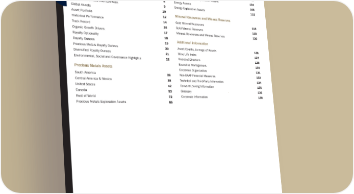 C O N T E N T S Overview Message to Stakeholders 5 Our History 6 Our Business Model 7 Funding Successful Mines 8 Diversified Portfolio With Low Risk 9 Global Assets 10 Asset Portfolio 12 Historical Performance 14 Track Record 16 Organic Growth Drivers 17 Royalty Optionality 18 Royalty Ounces 19 Precious Metals Royalty Ounces 20 Diversified Royalty Ounces 21 Environmental, Social and Governance Highlights 22 Precious Metals Assets South America 28 Central America & Mexico 38 United States 42 Canada 53 Rest of World 72 Precious Metals Exploration Assets 85 Diversified Assets Iron Ore 92 Other Mining 95 Diversified (Mining) Exploration Assets 104 Energy Assets 106 Energy Exploration Assets 115 Mineral Resources and Mineral Reserves Gold Mineral Resources 118 Gold Mineral Reserves 119 Mineral Resources and Mineral Reserves 120 Additional Information Asset Counts, Acreage of Assets 126 Mine Life Index 127 Board of Directors 128 Executive Management 130 Corporate Organization 131 Non-GAAP Financial Measures 132 Technical and Third-Party Information 134 Forward-Looking Information 135 Glossary 136 Corporate Information 138 This Asset Handbook has not been prepared in connection with the sale of securities and is not an offering memorandum and should not be relied upon as such. This Asset Handbook does not constitute an offer to sell or a solicitation for an offer to purchase any security in any jurisdiction. Information relating to projects, properties and their owners and operators presented in this Asset Handbook has been sourced from the public disclosure of the owners and operators of our assets available as at March 8, 2024 (except where stated otherwise). More current information may become available in our subsequent disclosure and on our website. This Asset Handbook contains information about many of our assets, including those that may not currently be material to us. Also, the description and depiction of our business and assets have been simplified for presentation purposes. Dollar references are in U.S. dollars unless otherwise noted. This Asset Handbook should be read with reference to the explanatory notes and cautionary statements contained in the Additional Information section found at the end of this Asset Handbook. Please also refer to the additional supporting information and explanatory notes found in our Annual Information Form (“AIF”), our annual Management’s Discussion & Analysis (“MD&A“), and our Annual Report on Form 40-F available at www.sedarplus.com and www.sec.gov, respectively, and on our website at www.franco-nevada.com. This Asset Handbook complements but does not form part of such documents. Overview