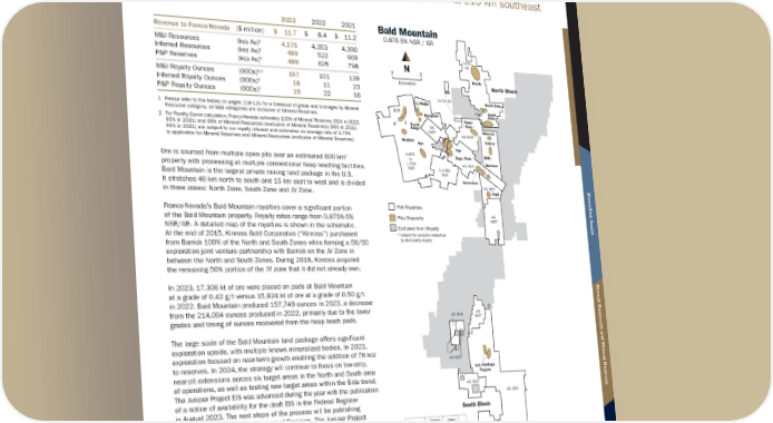 B A L D M O U N T A I N Location: Nevada, United States | Operator: Kinross Gold Corporation | Precious Metals: Au | Royalty: NSR/GR: 0.875-5% The Bald Mountain mine lies within the Southern Ruby Mountains of northeastern Nevada along the southern extension of the prolific Carlin Trend, 110 km southeast of Elko. 2023 2022 2021 Revenue to Franco-Nevada ($ million) $ 11.7 $ 8.4 $ 11.2 M&I Resources (koz Au) 1 4,175 4,353 4,390 Inferred Resources (koz Au) 1 489 522 669 P&P Reserves (koz Au) 1 489 625 798 M&I Royalty Ounces (000s) 1,2 157 101 139 Inferred Royalty Ounces (000s) 2 18 11 23 P&P Royalty Ounces (000s) 2 19 22 16 1 Please refer to the tables on pages 118-124 for a breakout of grade and tonnages by Mineral Resource category; all M&I categories are inclusive of Mineral Reserves 2 For Royalty Ounce calculation, Franco-Nevada estimates 100% of Mineral Reserves (91% in 2022, 95% in 2021) and 99% of Mineral Resources (exclusive of Mineral Reserves) (96% in 2022, 95% in 2021) are subject to our royalty interest and estimates an average rate of 3.79% is applicable for Mineral Reserves and Mineral Resources (exclusive of Mineral Reserves) Ore is sourced from multiple open pits over an estimated 600 km 2 property with processing at multiple conventional heap leaching facilities. Bald Mountain is the largest private mining land package in the U.S. It stretches 40 km north to south and 15 km east to west and is divided in three zones: North Zone, South Zone and JV Zone. Franco-Nevada’s Bald Mountain royalties cover a significant portion of the Bald Mountain property. Royalty rates range from 0.875%-5% NSR/GR. A detailed map of the royalties is shown in the schematic. At the end of 2015, Kinross Gold Corporation (“Kinross”) purchased from Barrick 100% of the North and South Zones while forming a 50/50 exploration joint venture partnership with Barrick on the JV Zone in between the North and South Zones. During 2018, Kinross acquired the remaining 50% portion of the JV zone that it did not already own. In 2023, 17,306 kt of ore were placed on pads at Bald Mountain at a grade of 0.42 g/t versus 15,924 kt of ore at a grade of 0.50 g/t in 2022. Bald Mountain produced 157,749 ounces in 2023, a decrease from the 214,094 ounces produced in 2022, primarily due to the lower grades and timing of ounces recovered from the heap leach pads. The large scale of the Bald Mountain land package offers significant exploration upside, with multiple known mineralized bodies. In 2023, exploration focused on near-term growth enabling the addition of 78 koz to reserves. In 2024, the strategy will continue to focus on low-strip, near-pit extensions across six target areas in the North and South area of operations, as well as testing new target areas within the Bida trend. The Juniper Project EIS was advanced during the year with the publication of a notice of availability for the draft EIS in the Federal Register in August 2023. The next steps of the process will be publishing the Final EIS and issuing a Record of Decision. The Juniper Project would modify and expand operations within the North Operations Area (NOA) and potentially extend the NOA mine life by 11 years. Large land package and significant exploration upside Potential to add significant mine life through the Juniper Project FNV Royalties Excluded from Royalty Pits/Deposits * Subject to possible reduction by third-party royalty North Block South Block Galaxy Poker Flats Bida Saga Yankee Targets Lux/Vantage Targets Top Sage Flats Belmont Horseshoe 4% NSR 4% NSR 4% NSR 4% NSR 4% NSR * 4% NSR * 4% NSR * 4% NSR * 4% NSR * 4% NSR * 4% NSR * 0.875 to 1.75% NSR 2.418% NSR Royale 1%-5% GR Redbird 5 1 LJ Ridge Banghart South Ridge Rat North Duke South Duke 2/3 1%-5% GR Winrock Bald Mountain Oregon Idaho Utah Nevada California Arizona Mexico Pacific Ocean Bald Mountain 0.875-5% NSR / GR kilometer 2 0 N Franco-Nevada Corporation ★ 47 TSX / NYSE: FNV United States