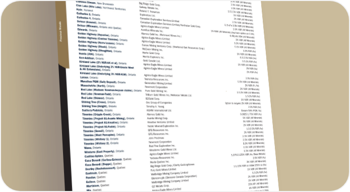 Asset Operator Interest and % 1 Canada New Prosperity , British Columbia Taseko Mines Limited Stream 22% (Au) Spences Bridge (Talisker) , British Columbia Talisker Resources Ltd. 2.5% NSR (All Minerals) Spences Bridge (Westhaven) , British Columbia Westhaven Gold Corp. 2% NSR (All Minerals) Taken , British Columbia Independence Gold Corp. 2-4% NSR (All Minerals) (buy-back option to 1%) Tide , British Columbia 0945473 B.C. Ltd. 1.5% NSR (All Minerals) Maverick (Nokomis) , Manitoba Minnova Corp. 2-3% NSR (All Minerals) Maverick (Puffy Lake) , Manitoba Minnova Corp. 2-3% NSR (All Minerals) Oxford Lake , Manitoba Big Ridge Gold Corp. 1.5-2.5% NSR (All Minerals) Clarence Stream , New Brunswick Galway Metals Inc. 1% NSR (All Minerals) Clan Lake (Sito Lake) , Northwest Territories Roland T. Trenaman 2% NSR (All Minerals) Hyde , Nunavut Exploratus Ltd. 2.5% NSR (All Minerals) Catharine 1 , Ontario Canadian Exploration Services Limited 1/3 of a 2-3% NSR (All Minerals) Catharine 4 , Ontario Canadian Exploration Services Limited/Northstar Gold Corp. 2-3% NSR (All Minerals) Detour (Gowest) , Ontario Agnico Eagle Mines Limited 1% NSR (All Minerals) (buy-back option on 0.5%) Detour (Mikwam) , Ontario and Quebec Aurelius Minerals Inc. 0.4824% NSR (All Minerals) Edwards , Ontario Alamos Gold Inc. (Richmont Mines Inc.) 2% NSR (All Minerals) Golden Highway (Aquarius) , Ontario Agnico Eagle Mines Limited 1-2% NSR (All Minerals) Golden Highway (Central Timmins) , Ontario Agnico Eagle Mines Limited 0-1% NSR (All Minerals) Golden Highway (Kerrs Leases) , Ontario Canoe Mining Ventures Corp. (Sheltered Oak Resources Corp.) 1-2% NSR (Au) Golden Highway (Stock) , Ontario McEwen Mining Inc. 1% NSR (All Minerals) Golden Highway (Stoughton) , Ontario Harte Gold Corp. 0.5-2.5% NSR (Au) Hemlo (JOA) , Ontario Hemlo Explorers Inc. 0.5-1% NSR (Au) Kerr-Addison , Ontario Gold Candle Ltd. 1% NSR (All Minerals) Kirkland Lake (2% NSR-AK et al) , Ontario Agnico Eagle Mines Limited 2% NSR (Au) Kirkland Lake (Underlying 2% NSR-Gracie West & AK Extensions) , Ontario Agnico Eagle Mines Limited 2% NSR (Au) Kirkland Lake (Underlying 3% NSR-KLW) , Ontario Agnico Eagle Mines Limited 2-3% NSR (Au) Larose , Ontario Tashota Resources Inc. 0.5% NSR (All Minerals) Marathon PGM (Sally Deposit) , Ontario Generation Mining Limited 2% NSR (Pt, Pd) Musselwhite (North) , Ontario Newmont Corporation 2% NSR (All Minerals) Red Lake (Madsen: Newman-Heyson claims) , Ontario Pure Gold Mining Inc. 1.5-2% NSR (All Minerals) Red Lake (Newman-Todd) , Ontario Trillium Gold Mines Inc./Heliostar Metals Ltd. 1.5-2% NSR (Au) Red Lake (Skinner) , Ontario B2Gold Corp. 1% NSR (All Minerals) Shining Tree (Creso) , Ontario Ore Group of Companies Option to acquire 2% NSR (All Minerals) Shining Tree (Knight) , Ontario Timothy A. Young 2-3% NSR (Au) Sudbury-Podolsky , Ontario KGHM International Ltd. Stream 50% (PGM, Au) Timmins (Cripple Creek) , Ontario Alamos Gold Inc. 0.3825-1.75% NSR (Au) Timmins (Project 81-Avante Mining) , Ontario Avante Mining Corp. 5% NSR (All Minerals) Timmins (Project 81-Kreative) , Ontario Kreative Ventures Limited 5% NSR (All Minerals) Timmins (Project 81-Noble) , Ontario Noble Mineral Exploration Inc. 2% NSR (All Minerals) Timmins (Sewell) , Ontario GFG Resources Inc. 1.5-2.5% NSR (Au) Timmins (West Porcupine) , Ontario GFG Resources Inc. 2% NSR (All Minerals) Timmins (Whitney 1) , Ontario John Prochnau 2.5% NSR (All Minerals) Timmins (Whitney 2) , Ontario Newmont Corporation 2.5% NSR (All Minerals) Wawa , Ontario Red Pine Exploration Inc. 1.5% NSR (All Minerals) Windarra (East Property) , Ontario Wesdome Gold Mines Ltd. 0.5% NSR (All Minerals) Cadillac-Sphinx , Quebec Agnico Eagle Mines Limited 1.5% NSR (All Minerals) Casa Berardi (Caribou-Estrees) , Quebec Yorbeau Resources Inc. 1.275-2.125% NSR (Au, Base Metals) Casa Berardi (Dieppe) , Quebec Hecla Quebec Inc. 2-3% NSR (Au) Destiny (Rochebaucourt) , Quebec Big Ridge Gold Corp./Clarity Gold-optionee 3% NSR (All Minerals) Eastmain , Quebec Fury Gold Mines Limited 1-1.15% NSR on initial 250K oz (Au) Fenelon , Quebec Wallbridge Mining Company Limited 1% NSR (All Minerals) Galinee , Quebec Glencore plc (Glencore Canada Corporation) 1.5-2% NSR (Au) Martiniere , Quebec Wallbridge Mining Company Limited 2% NSR (All Minerals) Mia , Quebec Q2 Metals Corp. 2% NSR (All Minerals) Norlartic-Camflo , Quebec Agnico Eagle Mines Limited 25% NPI (All Minerals) N2 (Northway-Noyon) , Quebec Wallbridge Mining Company Limited 1% NSR (All Minerals) Phoenix , Quebec Bonterra Resources Inc. 0.5% NSR (All Minerals) (buy-back option on 0.25%) Wilson (Verneuil) , Quebec Cartier Resources Inc. 0.5% NSR (All Minerals) Flume , Yukon Commander Resources Ltd. 2.5% NSR (All Minerals) (buy-back option to 1%) Hy , Yukon Lions Bay Mining Corp. 2% NSR (All Minerals) (buy-back option to 1%) TSX / NYSE: FNV 86 ★ Franco-Nevada Corporation Precious Metals Exploration Assets