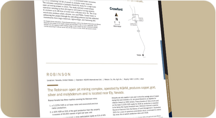 C R A W F O R D Location: Ontario, Canada | Operator: Canada Nickel Company | Metals: Ni, Co, Cr & PGM | Royalty: NSR: 2% Canada Nickel Company is advancing its Crawford nickel-cobalt sulphide project near Timmins, Ontario where Franco-Nevada holds a 2% NSR on all metals. Crawford represents one of the largest undeveloped nickel resources globally, containing 3.8 Mt of proven & probable nickel reserves. The company completed a bankable feasibility study for a large-scale open pit mining project in 2023. The study outlined a multi-phase operation ramping up from 60 ktpd to 120 ktpd of milling capacity to produce up to 48 ktpa of nickel over a 40-year mine life. The mine would also produce cobalt, chrome, iron and PGMs. Canda Nickel is advancing the project through the permitting process and has attracted investments from Anglo American, Agnico-Eagle, and Samsung SDI. For Royalty Ounce calculation, Franco-Nevada estimates 100% of the Mineral Resources and Mineral Reserves are subject to our royalty interest and estimates a rate of 2.0% is applicable. Franco- Nevada has also applied a NSR smelting charge of 30%. Nickel has been converted to Royalty Ounces assuming $7.89 per pound ($11.00 per pound in 2022, $9.00 per pound in 2021) R O B I N S O N Location: Nevada, United States | Operator: KGHM International Ltd. | Metals: Cu, Mo, Ag & Au | Royalty: NSR: 0.225% / other The Robinson open pit mining complex, operated by KGHM, produces copper, gold, silver and molybdenum and is located near Ely, Nevada. Franco-Nevada has three royalties covering the Robinson mine: 1. a 0.225% NSR on all base metal and associated precious metal production; 2. a 10% NSR on 51% of the gold production from the property in excess of 60,000 ounces of gold per year; and 3. under a copper agreement, a price participation royalty on 51% of 40% of each pound of copper production from the property in excess of 130 million pounds of copper produced per annum, multiplied by the spot price, less $1.00 per pound adjusted for inflation (based on 1990 dollars). Amounts are only payable in any year in which the average price of copper during that year exceeds a $1 per pound threshold, as adjusted for inflation (based on 1990 dollars). Franco-Nevada will likely only be paid on the base 0.225% NSR royalty for 2024 as production is expected to be below the royalty threshold level. Robinson received a positive Record of Decision from the Bureau of Land Management in September 2021 for a plan of operations amendment which is estimated to extend the mine life at current production rates until 2028. For Royalty Ounce calculation, Franco-Nevada estimates 100% of the gold and copper Mineral Resources and Mineral Reserves are subject to our royalty interest and estimates an average rate of 0.225% is applicable for gold and 0.1913% for copper (which factors a NSR smelting charge of 15%). Copper has been converted to Royalty Ounces assuming $3.75 per pound ($4.00 per pound in 2022, $3.50 per pound in 2021) Crawford kilometer N Timmins Crawford Annex Crawford Main Zone Resource 455 5 0 Franco-Nevada Corporation ★ 101 TSX / NYSE: FNV Other Mining