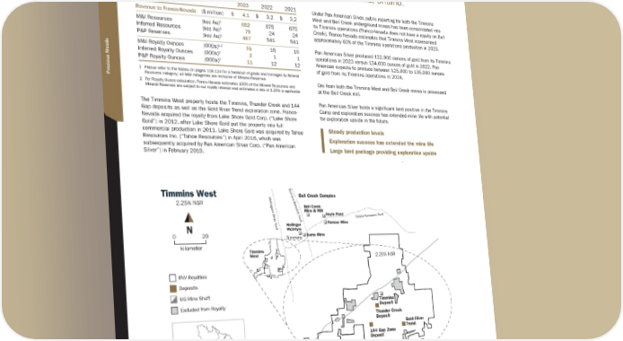 Canada TIMMINS WEST w Location: Ontario, Canada | Operator: Pan American Silver Corp. | Precious Metals: Au | Royalty: NSR: 2.25% vie Over Franco-Nevada’s Timmins West 2.25% NSR royalty covers a large land package 2 of approximately 130 km to the west of the City of Timmins, Ontario. 2023 2022 2021 Under Pan American Silver, public reporting for both the Timmins Revenue to Franco-Nevada ($ million) $ 4.1 $ 3.2 $ 3.2 West and Bell Creek underground mines has been consolidated into M&I Resources (koz Au)1 652 675 675 its Timmins operations (Franco-Nevada does not have a royalty on Bell Inferred Resources (koz Au)1 79 24 24 Creek). Franco-Nevada estimates that Timmins West represented P&P Reserves (koz Au)1 467 541 541 approximately 60% of the Timmins operations production in 2023. M&I Royalty Ounces (000s)1,2 15 15 15 Pan American Silver produced 132,900 ounces of gold from its Timmins Inferred Royalty Ounces (000s)2 2 1 1 operations in 2023 versus 134,600 ounces of gold in 2022. Pan P&P Royalty Ounces (000s)2 11 12 12 American expects to produce between 125,000 to 135,000 ounces of gold from its Timmins operations in 2024. 1 Please refer to the tables on pages 118-124 for a breakout of grade and tonnages by Mineral Precious Metals Resource category; all M&I categories are inclusive of Mineral Reserves Ore from both the Timmins West and Bell Creek mines is processed 2 For Royalty Ounce calculation, Franco-Nevada estimates 100% of the Mineral Resources and at the Bell Creek mill. Mineral Reserves are subject to our royalty interest and estimates a rate of 2.25% is applicable The Timmins West property hosts the Timmins, Thunder Creek and 144 Pan American Silver holds a significant land position in the Timmins Gap deposits as well as the Gold River Trend exploration zone. Franco- Camp and exploration success has extended mine life with potential Nevada acquired the royalty from Lake Shore Gold Corp. (“Lake Shore for exploration upside in the future. Gold”) in 2012, after Lake Shore Gold put the property into full Steady production levels commercial production in 2011. Lake Shore Gold was acquired by Tahoe Resources Inc. (“Tahoe Resources”) in April 2016, which was Exploration success has extended the mine life subsequently acquired by Pan American Silver Corp. (“Pan American Large land package providing exploration upside Silver”) in February 2019. Bur Timmins West Mattagami River F rows Benedict F Bell Creek Complex 2.25% NSR Bell Creek Mine & Mill Hoyle Pond ault ault orcupine F Destor-P ault Hollinger Pamour Mine N McIntyre 0 20 Timmins Dome Mine kilometer Timmins West 2.25% NSR FNV Royalties Deposits UG Mine Shaft Excluded from Royalty Timmins Deposit Thunder Creek 1 Deposit 0 1 Gold River Trend 144 Gap Zone Ontario Quebec Deposit Timmins West 62 ★ Franco-Nevada Corporation TSX / NYSE: FNV