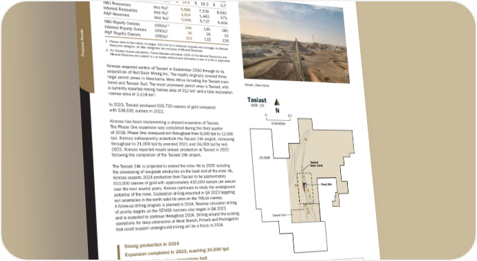 T A S I A S T Location: Mauritania | Operator: Kinross Gold Corporation | Precious Metals: Au | Royalty: NSR: 2% Franco-Nevada has a 2% NSR royalty on the Tasiast project operated by Kinross. 2023 2022 2021 Revenue to Franco-Nevada ($ million) $ 24.5 $ 18.3 $ 6.7 M&I Resources (koz Au) 1 6,985 7,239 8,992 Inferred Resources (koz Au) 1 1,504 1,443 971 P&P Reserves (koz Au) 1 5,055 5,737 6,404 M&I Royalty Ounces (000s) 1,2 140 145 180 Inferred Royalty Ounces (000s) 2 30 29 19 P&P Royalty Ounces (000s) 2 101 115 128 1 Please refer to the tables on pages 118-124 for a breakout of grade and tonnages by Mineral Resource category; all M&I categories are inclusive of Mineral Reserves 2 For Royalty Ounce calculation, Franco-Nevada estimates 100% of the Mineral Resources and Mineral Reserves are subject to our royalty interest and estimates a rate of 2.0% is applicable Kinross acquired control of Tasiast in September 2010 through to its acquisition of Red Back Mining Inc. The royalty originally covered three large permit areas in Mauritania, West Africa including the Tasiast main trend and Tasiast Sud. The most prominent permit area is Tasiast, with a currently reported mining license area of 312 km 2 and a total exploration license area of 3,118 km 2. In 2023, Tasiast produced 620,793 ounces of gold compared with 538,591 ounces in 2022. Kinross has been implementing a phased expansion of Tasiast. The Phase One expansion was completed during the third quarter of 2018. Phase One increased mill throughput from 8,000 tpd to 12,000 tpd. Kinross subsequently undertook the Tasiast 24k project, increasing throughput to 21,000 tpd by year-end 2021 and 24,000 tpd by mid- 2023. Kinross reported record annual production at Tasiast in 2023 following the completion of the Tasiast 24k project. The Tasiast 24k is projected to extend the mine life to 2035 including the processing of low-grade stockpiles on the back end of the mine life. Kinross expects 2024 production from Tasiast to be approximately 610,000 ounces of gold with approximately 430,000 ounces per annum over the next several years. Kinross continues to study the underground potential of the mine. Exploration drilling resumed in Q4 2023 targeting soil anomalies in the north satellite area on the TMLSA license. A follow-up drilling program is planned in 2024. Reverse circulation drilling of priority targets on the SENISA licenses also began in Q4 2023 and is expected to continue throughout 2024. Drilling around the existing operations for deep extensions at West Branch, Piment and Prolongation that could support underground mining will be a focus in 2024. Tasiast, Mauritania Strong production in 2024 Expansion completed in 2023, reaching 24,000 tpd Prospective 75 km long greenstone belt Tasiast Mauritania Mali Senegal Algeria Atlantic Ocean N kilometer 10 0 Tasiast NSR: 2% Tasiast Main Trend Plant Site Tasiast Sud 2% NSR Tasiast Mining License Tasiast License Area, March 2012 Tasiast Sud Gold Prospects Resource/Reserve Target Trends FNV Royalties TSX / NYSE: FNV 76 ★ Franco-Nevada Corporation Rest of World