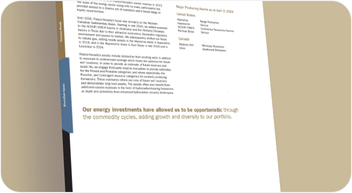 E N E R G Y A S S E T S Franco-Nevada has owned and invested in energy assets since inception. Our energy investments have allowed us to be opportunistic through the commodity cycles, adding growth and diversity to our portfolio. Energy revenue was 17% of Franco-Nevada’s overall revenue in 2023. The scale of the energy sector along with its many participants has provided access to a diverse set of operators and a broad range of royalty opportunities. Until 2016, Franco-Nevada’s focus was primarily on the Western Canadian Sedimentary Basin. Starting in late 2016, we added exposure to the SCOOP/STACK basins in Oklahoma and the Midland/Delaware basins in Texas due to their attractive economics, favourable regulatory environment and access to market. We subsequently shifted our focus to natural gas, adding royalty assets in the Marcellus shale in Appalachia in 2019, and in the Haynesville shale in East Texas in late 2020 and in Louisiana in 2024. Franco-Nevada’s assets include production from existing wells in addition to exposure to undeveloped acreage which hosts the potential for future well locations. In order to provide an estimate of future reserves and asset life, we engage third-party reserve evaluators to provide estimates for the Proved and Probable categories, and where appropriate, the Possible, and Contingent resource categories for currently producing formations. These estimates inform our view of future well locations and demonstrate long-lived assets. The assets often also benefit from additional upside exposure in the form of hydrocarbon-bearing formations at depth and potentially from enhanced hydrocarbon recovery techniques. Major Producing Assets as at April 2, 2024 United States Marcellus Range Resources Haynesville Various SCOOP/STACK Continental Resources/Various Permian Basin Various Canada Weyburn Unit Whitecap Resources Orion Strathcona Resources Our energy investments have allowed us to be opportunistic through the commodity cycles, adding growth and diversity to our portfolio. Oil and Gas Information Advisory In this Asset Handbook, certain natural gas volumes have been converted to barrels of oil equivalent on the basis of six Mcf to one bbl. Boe and mboe may be misleading, particularly if used in isolation. A conversion ratio of six Mcf to one bbl is based on an energy equivalency ratio and does not represent a value equivalency. TSX / NYSE: FNV 106 ★ Franco-Nevada Corporation