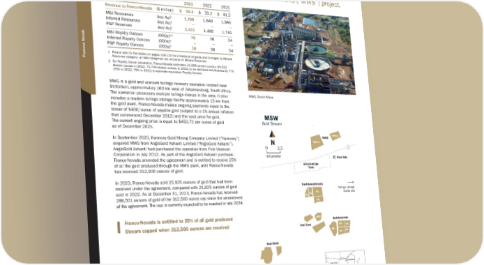 Rest of World MWS w Location: South Africa | Operator: Harmony Gold Mining Company Limited | Precious Metals: Au | Stream: 25% Gold Stream vie Over Franco-Nevada, through its acquisition of Gold Wheaton in March 2011, receives 25% of gold produced from the Mine Waste Solutions (“MWS”) project. 2023 2022 2021 Revenue to Franco-Nevada ($ million) $ 50.4 $ 39.2 $ 41.3 M&I Resources (koz Au)1 1,789 1,849 1,946 Inferred Resources (koz Au)1 − – – P&P Reserves (koz Au)1 1,431 1,485 1,749 M&I Royalty Ounces (000s)1,2 19 38 54 Inferred Royalty Ounces (000s)2 – – – 2 18 P&P Royalty Ounces (000s) 38 54 1 Please refer to the tables on pages 118-124 for a breakout of grade and tonnages by Mineral Precious Metals Resource category; all M&I categories are inclusive of Mineral Reserves 2 For Royalty Ounce calculation, Franco-Nevada estimates 23,999 stream ounces (49,923 stream ounces in 2022, 71,749 stream ounces in 2021) to be delivered and factored by 77% (75% in 2022, 75% in 2021) to estimate equivalent Royalty Ounces MWS is a gold and uranium tailings recovery operation located near Stilfontein, approximately 160 km west of Johannesburg, South Africa. The operation processes multiple tailings dumps in the area. It also MWS, South Africa includes a modern tailings storage facility approximately 15 km from the gold plant. Franco-Nevada makes ongoing payments equal to the lesser of $400/ounce of payable gold (subject to a 1% annual inflation that commenced December 2012) and the spot price for gold. MSW The current ongoing price is equal to $450.72 per ounce of gold Gold Stream as of December 2023. MWS MWS 4 In September 2020, Harmony Gold Mining Company Limited (“Harmony”) N MWS 5 acquired MWS from AngloGold Ashanti Limited (“AngloGold Ashanti”). N AngloGold Ashanti had purchased the operation from First Uranium 0 2.5 12 Corporation in July 2012. As part of the AngloGold Ashanti purchase, kilometer Plant Site Franco-Nevada amended the agreement and is entitled to receive 25% of all the gold produced through the MWS plant, until Franco-Nevada STILFONTEIN has received 312,500 ounces of gold. Town In 2023, Franco-Nevada sold 25,925 ounces of gold that had been received under the agreement, compared with 21,825 ounces of gold Hartebeestfontein sold in 2022. As at December 31, 2023, Franco-Nevada has received Tailings storage H5 H1 facility site 288,501 ounces of gold of the 312,500 ounce cap since the amendment H6 of the agreement. The cap is currently expected to be reached in late 2024. H2 Franco-Nevada is entitled to 25% of all gold produced SPD Buffelsfontein Stream capped when 312,500 ounces are received Vaal East B2 B1 B5 B4 B3 Vaal West Zimbabwe Namibia Botswana Mozambique MWS AngloGold Ashanti Dumps South Africa Indian Atlantic Ocean Ocean 74 ★ Franco-Nevada Corporation TSX / NYSE: FNV