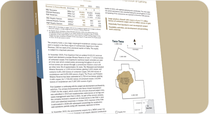 Other Mining TACA TACA w Location: Argentina, South America | Operator: First Quantum Minerals Ltd. | Metals: Cu, Au & Mo | Royalty: NSR: 1.08% vie Over Franco-Nevada has a 1.08% NSR royalty on all copper, gold and molybdenum produced from Taca Taca which was acquired through the acquisition of Lumina Royalty Corp. in December 2011. 2023 2022 2021 quarter of 2023, with eighteen pumping wells constructed. The initial water Revenue to Franco-Nevada ($ million) $ − $ – $ – use permit applications were submitted during the second quarter of 2023 1 and granting of the concessions are expected to follow the ESIA approval. M&I Resource (Mlbs Cu) 20,835 20,835 20,835 1 Inferred Resource (Mlbs Cu) 4,863 4,863 4,863 1 Large porphyry deposit with reserve of over 7.7 million P&P Reserves (Mlbs Cu) 17,052 17,052 17,052 1,2 tonnes of contained copper and 5.1 million ounces of gold M&I Royalty Ounces (000s) 368 490 437 2 Potentially First Quantum’s next development project Inferred Royalty Ounces (000s) 86 112 100 2 Precious Metals P&P Royalty Ounces (000s) 301 403 359 Feasibility activities, pre-development and permitting 1 Please refer to the tables on pages 118-124 for a breakout of grade and tonnages by Mineral work underway Resource category; all M&I categories are inclusive of Mineral Reserves 2 For Royalty Ounce calculation, Franco-Nevada estimates 100% of the Mineral Resources and Mineral Reserves are subject to our royalty interest and estimates a rate of 0.918% is applicable for the copper Royalty Ounces (which factors in a NSR smelting charge of 15%). Copper has been converted to Royalty Ounces assuming $3.75 per pound ($4.00 per pound in 2022, $3.50 per pound in 2021) Taca Taca The property hosts a very large copper-gold-molybdenum porphyry system 1.08% NSR N and is located in the Puna region of northwestern Argentina in Salta 0 5 Province, 230 km west of the provincial capital of Salta. The royalty kilometer is subject to a buy-back provision. In November 2020, First Quantum filed an updated NI 43-101 technical 1.08% NSR sified Assets report and declared a maiden Mineral Reserve of over 7.7 million tonnes of contained copper. First Quantum’s technical report considers an open Diver pit mine plan which contemplates processing throughput of up to 60 million tonnes per annum through a conventional flotation circuit with an initial mine life of approximately 32 years. The Measured and Indicated Mineral Resource is 2,203 million tonnes, grading 0.43% copper, and contains 9,451,000 tonnes of contained copper, 265,000 tonnes of molybdenum and 6,052,000 ounces of gold. The Proven and Probable Mineral Reserve has been estimated at 1,759 million tonnes, grading 0.44% copper, for 7,735,000 tonnes of contained copper, 214,000 First Quantum tonnes of molybdenum and 5,087,000 ounces of gold. 2020 Technical Report Ultimate First Quantum is continuing with the project pre-development and feasibility Pit Design activities. The primary Environmental and Social Impact Assessment (“ESIA”) for the project, which covers the principal proposed project sites, was submitted in 2019 and supplementary submissions on tailings and Arica waste management were filed in 2022. As part of the revision process, N the company received a second set of observations to the ESIA in June 1.08% NSR Iquique Bolivia 2023 and submitted responses in October 2023. Approval of the ESIA is anticipated in 2024 with subsequent proceedings for construction and operations permits along with necessary approvals to follow. Antofagasta Peru In November 2022, the environmental aspects for a 345kV power line development was approved, however it will require detailed construction Pacic Ocean Taca Taca permits and the final ESIA to be approved. An additional environmental Royalty Area pre-feasibility ESIA was submitted in 2021 for a bypass and access road Copiapo NuevaUnión construction which approval is underway. The project will also require (Relincho) Argentina approval of concessions for borefield water supply for the mine. The Phase III La Serena groundwater exploration campaign successfully concluded during the second 96 ★ Franco-Nevada Corporation TSX / NYSE: FNV