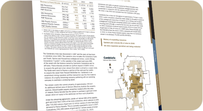 C A N D E L A R I A Location: Chile, South America | Operator: Lundin Mining Corporation | Precious Metals: Au & Ag | Stream: Gold and Silver Stream In November 2014, Franco-Nevada (Barbados) Corporation acquired a gold and silver stream on production from the Candelaria operation in Chile. 2023 2022 2021 Revenue to Franco-Nevada ($ million) $ 130.3 $ 125.8 $ 116.5 M&I Resources (koz Au) 1 5,895 5,336 5,600 Inferred Resources (koz Au) 1 606 484 500 P&P Reserves (koz Au) 1 2,235 2,479 2,700 M&I Resources (Moz Ag) 1 86.6 80.6 83.0 Inferred Resources (Moz Ag) 1 6.3 5.6 7.0 P&P Reserves (Moz Ag) 1 32.1 36.2 39.0 M&I Royalty Ounces (000s) 1, 2 1,586 1,456 1,586 Inferred Royalty Ounces (000s) 2 145 115 125 P&P Royalty Ounces (000s) 2 665 746 851 1 Please refer to the tables on pages 118-124 for a breakout of grade and tonnages by Mineral Resource category; all M&I categories are inclusive of Mineral Reserves 2 For Royalty Ounce calculation, Franco-Nevada estimates P&P Royalty Ounces include payable metal of the balance of the 720,000 ounces of gold and 12 million ounces of silver remaining and the balance of P&P Reserves subject to the lower stream percentage. For M&I Royalty Ounces, Franco-Nevada has assumed the P&P Royalty Ounces with the balance of M&I Resources subject to the lower stream percentage. For Inferred Royalty Ounces, Franco- Nevada assumes Inferred Mineral Resources are subject to the lower stream percentage. Silver is converted to Royalty Ounces assuming $1,950/oz gold and $22.50/oz silver ($1,800/oz gold and $21.00/oz silver in 2022, $1,800/oz gold and $23.00/oz silver in 2021). The stream interest has been factored by 78% to reflect $1,950 per ounce gold and $428.85 per ounce ongoing payments (76% in 2023, 76% in 2022) The Candelaria mine was discovered in 1987 and the open pit has been in operation since 1993. The operation also includes the Candelaria North and South, Santos and Alcaparrosa underground mines. Lundin Mining Corporation (“Lundin”) is the operator of the project and owns 80% of the asset with the balance owned by Sumitomo Corporation and its affiliates. Franco-Nevada provided an up-front deposit of $655 million to acquire the gold and silver stream from what is primarily a copper mine. The funds were used to finance a portion of the cost paid by Lundin to acquire the asset from Freeport-McMoRan Inc. Candelaria is an established mining operation and the transaction was the first material instance of a royalty/streaming company partnering with an operating company to purchase a producing asset. The stream covers the current property of approximately 150 km 2 . An additional defined area of interest effectively doubles the property position. Should Lundin acquire properties located within the area of interest, Franco-Nevada has the option to purchase a gold and silver stream which will apply to the additional ore from such properties. Under the streaming agreement, Lundin will deliver 68% of the payable gold and silver from 100% of the mine production, which reduces to 40% after 720,000 ounces of gold and 12 million ounces of silver have been delivered to Franco-Nevada. This is currently expected to occur in 2027. Cumulatively, 541,308 ounces of gold and 8.7 million ounces of silver have been delivered since acquisition until December 31, 2023. Franco-Nevada pays an ongoing price equal to the lesser of $428.85 per ounce of gold and $4.28 per ounce of silver or the then prevailing spot price for gold and silver for each ounce delivered under the stream. This price escalates by 1% per annum in October of each year. Lundin has made a significant investment in exploration at Candelaria and has extended the mine life from 2028, when it acquired Candelaria, to 2048. Lundin has successfully added to the Mineral Resources and Mineral Reserves at the four underground mines and has discovered the Española open pit deposit which is located partly on the stream concession and partly on ground covered by Franco-Nevada’s area of interest. Operations at the Alcaparrosa underground mine were suspended in connection with the sinkhole which occurred near the mine in July 2022 and excluded from the Candelaria LOM plans. Candelaria has a total mill throughput of approximately 79 ktpd. In early 2022, Lundin completed a feasibility study update for throughput expansion of the underground mines from 15 ktpd to up to 30 ktpd and included underground crushing and conveying systems and a surface secondary crushing plant although a construction decision has not yet been made. In 2023, Candelaria produced approximately 152 kt of copper, 90 koz of gold and 1.5 Moz of silver, on a 100% basis. Franco-Nevada sold 66,709 GEOs from the mine in 2023, compared with 69,854 GEOs in 2022. In 2024, Franco-Nevada expects sales from its Candelaria stream to be between 70,000 and 80,000 GEOs. History of expanding resources Updated plan extends life of mine to 2048 UG mine expansion permitted and being evaluated Tierra Amarilla Santos Mine Copiapo Candelaria North (U/G) Alcaparrosa Mine Candelaria Pit Candelaria South (U/G) La Española kilometer 0 2.5 N Candelaria Gold and Silver Stream Pacific Ocean Argentina Bolivia Peru Brazil Chile Candelaria Ojos del Salado Mining Property Candelaria Mining Property Area of Interest Pits Franco-Nevada Corporation ★ 29 TSX / NYSE: FNV South America