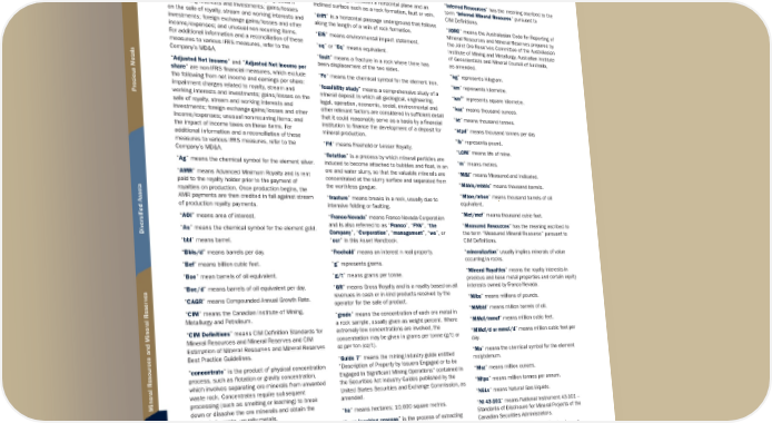 G L O S S A R Y “ A$ ” means Australian dollars. “ Adjusted EBITDA ” and “ Adjusted EBITDA per share ” are non-IFRS measures, which exclude the following from net income and earnings per share: income tax expense/recovery; finance expenses and finance income; depletion and depreciation; non-cash costs of sales; impairment charges related to royalty, stream and working interests and investments; gains/losses on the sale of royalty, stream and working interests and investments; foreign exchange gains/losses and other income/expenses; and unusual non-recurring items. For additional information and a reconciliation of these measures to various IFRS measures, refer to the Company’s MD&A. “ Adjusted Net Income ” and “ Adjusted Net Income per share ” are non-IFRS financial measures, which exclude the following from net income and earnings per share: impairment charges related to royalty, stream and working interests and investments; gains/losses on the sale of royalty, stream and working interests and investments; foreign exchange gains/losses and other income/expenses; unusual non-recurring items; and the impact of income taxes on these items. For additional information and a reconciliation of these measures to various IFRS measures, refer to the Company’s MD&A. “ Ag ” means the chemical symbol for the element silver. “ AMR ” means Advanced Minimum Royalty and is rent paid to the royalty holder prior to the payment of royalties on production. Once production begins, the AMR payments are then credited in full against stream of production royalty payments. “ AOI ” means area of interest. “ Au ” means the chemical symbol for the element gold. “ bbl ” means barrel. “ Bbls/d ” means barrels per day. “ Bcf ” means billion cubic feet. “ Boe ” mean barrels of oil equivalent. “ Boe/d ” means barrels of oil equivalent per day. “ CAGR ” means Compounded Annual Growth Rate. “ CIM ” means the Canadian Institute of Mining, Metallurgy and Petroleum. “ CIM Definitions ” means CIM Definition Standards for Mineral Resources and Mineral Reserves and CIM Estimation of Mineral Resources and Mineral Reserves Best Practice Guidelines. “ concentrate ” is the product of physical concentration process, such as flotation or gravity concentration, which involves separating ore minerals from unwanted waste rock. Concentrates require subsequent processing (such as smelting or leaching) to break down or dissolve the ore minerals and obtain the desired elements, usually metals. “ Cu ” means the chemical symbol for the element copper. “ cut-off grade ” means the lowest grade of Mineral Resource considered economic; used in the calculation of Mineral Resources and Mineral Reserves in a given deposit. “ Indicated Resources ” has the meaning ascribed to the term “Indicated Mineral Resource” pursuant to CIM Definitions. “ Inf ” means Inferred. “ Inferred Resources ” has the meaning ascribed to the term “ Inferred Mineral Resource ” pursuant to CIM Definitions. “ JORC ” means the Australasian Code for Reporting of Mineral Resources and Mineral Reserves prepared by the Joint Ore Reserves Committee of the Australasian Institute of Mining and Metallurgy, Australian Institute of Geoscientists and Mineral Council of Australia, as amended. “ kg ” represents kilogram. “ km ” represents kilometre. “ km 2 ” represents square kilometre. “ koz ” means thousand ounces. “ kt ” means thousand tonnes. “ ktpd ” means thousand tonnes per day “ lb ” represents pound. “ LOM ” means life of mine. “ m ” means metres. “ M&I ” means Measured and Indicated. “ Mbbls/mbbls ” means thousand barrels. “ Mboe/mboe ” means thousand barrels of oil equivalent. “ Mcf/mcf ” means thousand cubic feet. “ Measured Resources ” has the meaning ascribed to the term “Measured Mineral Resource” pursuant to CIM Definitions. “ mineralization ” usually implies minerals of value occurring in rocks. “ Mineral Royalties ” means the royalty interests in precious and base metal properties and certain equity interests owned by Franco-Nevada. “ Mlbs ” means millions of pounds. “ MMbbl ” means million barrels of oil. “ MMcf/mmcf ” means million cubic feet. “ MMcf/d or mmcf/d ” means million cubic feet per day. “ Mo ” means the chemical symbol for the element molybdenum. “ Moz ” means million ounces. “ Mtpa ” means million tonnes per annum. “ NGLs ” means Natural Gas Liquids. “ NI 43-101 ” means National Instrument 43-101 – Standards of Disclosure for Mineral Projects of the Canadian Securities Administrators. “ Ni ” means the chemical symbol for the element nickel. “ NPI ” means Net Profit Interest: the profits after deduction of expenses. “ diamond drill ” is a type of drill in which the rock cutting is done by abrasion, with a diamond impregnated bit, rather than by percussion. The drill cuts a core of rock which is recovered in long cylindrical sections. Syn: “ core drill ”. “ dip ” is the angle between a horizontal plane and an inclined surface such as a rock formation, fault or vein. “ drift ” is a horizontal passage underground that follows along the length of a vein of rock formation. “ EIS ” means environmental impact statement. “ eq ” or “ Eq ” means equivalent. “ fault ” means a fracture in a rock where there has been displacement of the two sides. “ Fe ” means the chemical symbol for the element iron. “ feasibility study ” means a comprehensive study of a mineral deposit in which all geological, engineering, legal, operation, economic, social, environmental and other relevant factors are considered in sufficient detail that it could reasonably serve as a basis by a financial institution to finance the development of a deposit for mineral production. “ FH ” means Freehold or Lessor Royalty. “ flotation ” is a