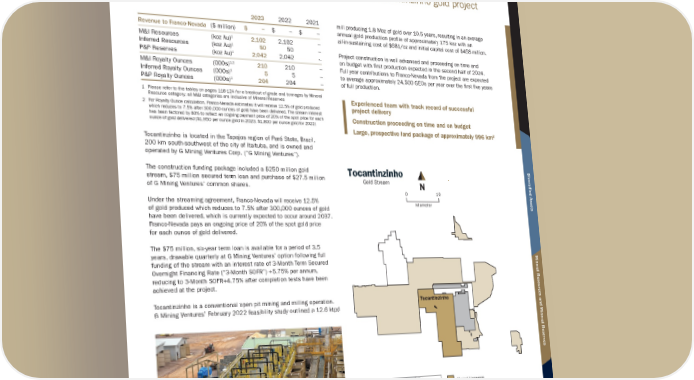 T O C A N T I N Z I N H O Location: Brazil, South America | Operator: G Mining Ventures Corp. | Precious Metals: Au | Stream: Gold Stream In July 2022, Franco-Nevada (Barbados) Corporation announced a $352.5 million funding package with G Mining Ventures Corp. on the Tocantinzinho gold project in Brazil. 2023 2022 2021 Revenue to Franco-Nevada ($ million) $ − $ – $ – M&I Resources (koz Au) 1 2,102 2,102 – Inferred Resources (koz Au) 1 50 50 – P&P Reserves (koz Au) 1 2,042 2,042 – M&I Royalty Ounces (000s) 1,2 210 210 – Inferred Royalty Ounces (000s) 1 5 5 – P&P Royalty Ounces (000s) 1 204 204 – 1 Please refer to the tables on pages 118-124 for a breakout of grade and tonnages by Mineral Resource category; all M&I categories are inclusive of Mineral Reserves 2 For Royalty Ounce calculation, Franco-Nevada estimates it will receive 12.5% of gold produced which reduces to 7.5% after 300,000 ounces of gold have been delivered. The stream interest has been factored by 80% to reflect an ongoing payment price of 20% of the spot price for each ounce of gold delivered ($1,950 per ounce gold in 2023, $1,800 per ounce gold for 2022) Tocantinzinho is located in the Tapajos region of Pará State, Brazil, 200 km south-southwest of the city of Itaituba, and is owned and operated by G Mining Ventures Corp. (“G Mining Ventures”). The construction funding package included a $250 million gold stream, $75 million secured term loan and purchase of $27.5 million of G Mining Ventures’ common shares. Under the streaming agreement, Franco-Nevada will receive 12.5% of gold produced which reduces to 7.5% after 300,000 ounces of gold have been delivered, which is currently expected to occur around 2037. Franco-Nevada pays an ongoing price of 20% of the spot gold price for each ounce of gold delivered. The $75 million, six-year term loan is available for a period of 3.5 years, drawable quarterly at G Mining Ventures’ option following full funding of the stream with an interest rate of 3-Month Term Secured Overnight Financing Rate (“3-Month SOFR”) +5.75% per annum, reducing to 3-Month SOFR+4.75% after completion tests have been achieved at the project. Tocantinzinho is a conventional open pit mining and milling operation. G Mining Ventures’ February 2022 feasibility study outlined a 12.6 ktpd mill producing 1.8 Moz of gold over 10.5 years, resulting in an average annual gold production profile of approximately 175 koz with an all-in-sustaining cost of $681/oz and initial capital cost of $458 million. Project construction is well advanced and proceeding on time and on budget with first production expected in the second half of 2024. Full year contributions to Franco-Nevada from the project are expected to average approximately 24,500 GEOs per year over the first five years of full production. Experienced team with track record of successful project delivery Construction proceeding on time and on budget Large, prospective land package of approximately 996 km 2 Tocantinzinho, Brazil Tocantinzinho Gold Stream kilometer 10 0 N Tocantinzinho Pacific Ocean Argentina Bolivia Peru Brazil Tocantinzinho Mining Licenses Exploration Licenses Excluded from Stream Licenses under application Franco-Nevada Corporation ★ 33 TSX / NYSE: FNV South America