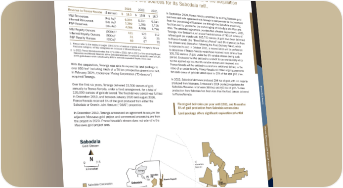 S A B O D A L A Location: Senegal | Operator: Endeavour Mining Corporation | Precious Metals: Au | Stream: Fixed gold deliveries / 6% Gold Stream In December 2013, Franco-Nevada (Barbados) Corporation, provided Teranga Gold Corporation (“Teranga”) with a $135 million deposit to fund the acquisition by Teranga of additional future ore sources for its Sabodala mill. 2023 2022 2021 Revenue to Franco-Nevada ($ million) $ 18.3 $ 16.8 $ 16.7 M&I Resources (koz Au) 1 6,333 6,333 6,640 Inferred Resources (koz Au) 1 1,380 1,380 1,728 P&P Reserves (koz Au) 1 4,086 4,086 4,796 M&I Royalty Ounces (000s) 1,2 111 120 112 Inferred Royalty Ounces (000s) 2 31 32 35 P&P Royalty Ounces (000s) 2 60 67 75 1 Please refer to the tables on pages 118-124 for a breakout of grade and tonnages by Mineral Resource category; all M&I categories are inclusive of Mineral Reserves 2 In 2023, Franco-Nevada estimates that 47% (49% in 2022, 42% in 2021) of the remaining Mineral Resources and Mineral Reserves at the Sabodala-Massawa Complex are subject to a rate of 4.8% (6.0% gold stream which is factored by 80% to estimate equivalent Royalty Ounce rate) With the acquisition, Teranga was able to expand its land package to over 950 km 2 including much of a 70 km prospective greenstone belt. In February 2021, Endeavour Mining Corporation (“Endeavour”) acquired Teranga. Over the first six years, Teranga delivered 22,500 ounces of gold annually to Franco-Nevada, under a fixed arrangement, for a total of 135,000 ounces of gold delivered. The fixed delivery period was fulfilled in December 2019, and between January 2020 and August 2020, Franco-Nevada received 6% of the gold produced from either the Sabodala or Oromin Joint Venture (“OJVG”) properties. In December 2019, Teranga announced an agreement to acquire the adjacent Massawa gold project and commenced processing ore from the project in 2020. Franco-Nevada’s stream does not extend to the Massawa gold project area. In September 2020, Franco-Nevada amended its existing Sabodala gold purchase and sale agreement with Teranga to compensate for displacement from the processing of Massawa ore through the Sabodala processing facilities and to provide for the commingling of Sabodala and Massawa ores. The amended agreement provides that effective September 1, 2020, Teranga, now Endeavour, will make fixed deliveries of 783.33 ounces of refined gold per month until 105,750 ounces of gold have been delivered to Franco-Nevada (the “Fixed Delivery Period”) and 6% of production from the stream area thereafter. Following the Fixed Delivery Period, which is expected to end in October 2031, a reconciliation will be performed to determine if Franco-Nevada would have received more or less than 105,750 ounces of gold under the 6% variable stream during such period. Endeavour will be entitled to a credit for an over-delivery which will be applied against the 6% variable stream until depleted and Franco-Nevada will be entitled to a one-time additional delivery in the case of an under-delivery. Franco-Nevada will make ongoing payments for each ounce of gold delivered equal to 20% of the spot gold price. In 2023, Sabodala-Massawa produced 294 koz of gold, with the majority produced from Massawa. Endeavour’s 2024 production guidance for Sabodala-Massawa is between 360 koz and 400 koz of gold. To date production from Sabodala has been less than the fixed ounces delivered to Franco-Nevada. Fixed gold deliveries per year until 2031, and thereafter 6% of gold production from Sabodala concessions Land package offers significant exploration potential kilometer 2.5 0 N Sabodala Gold Stream OJVG Concession Sabodala Concession Deposits Senegal Mali Mauritania Sabodala Dakar Guinea Atlantic Ocean 10 kilometres from mill Mill OJVG Sabodala Sabodala West Golouma Deposits Masato Deposit Niakafiri Deposit Sabodala Pit Tailings Gora Deposit Franco-Nevada Corporation ★ 75 TSX / NYSE: FNV Rest of World