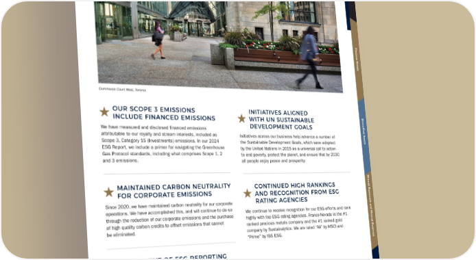 OUR SCOPE 3 EMISSIONS INCLUDE FINANCED EMISSIONS We have measured and disclosed financed emissions attributable to our royalty and stream interests, included as Scope 3, Category 15 (Investments) emissions. In our 2024 ESG Report, we include a primer for navigating the Greenhouse Gas Protocol standards, including what comprises Scope 1, 2 and 3 emissions. MAINTAINED CARBON NEUTRALITY FOR CORPORATE EMISSIONS Since 2020, we have maintained carbon neutrality for our corporate operations. We have accomplished this, and will continue to do so through the reduction of our corporate emissions and the purchase of high quality carbon credits to offset emissions that cannot be eliminated. ALIGNMENT OF ESG REPORTING WITH TCFD, SASB AND GRI Our ESG disclosure is aligned with leading reporting standards and frameworks, including the Sustainability Accounting Standards Board and Global Reporting Initiative standards and the Task Force on Climate-related Financial Disclosures framework. INITIATIVES ALIGNED WITH UN SUSTAINABLE DEVELOPMENT GOALS Initiatives across our business help advance a number of the Sustainable Development Goals, which were adopted by the United Nations in 2015 as a universal call to action to end poverty, protect the planet, and ensure that by 2030 all people enjoy peace and prosperity. CONTINUED HIGH RANKINGS AND RECOGNITION FROM ESG RATING AGENCIES We continue to receive recognition for our ESG efforts and rank highly with top ESG rating agencies. Franco-Nevada is the #1 ranked precious metals company and the #1 ranked gold company by Sustainalytics. We are rated “AA” by MSCI and “Prime” by ISS ESG. Commerce Court West, Toronto Franco-Nevada Corporation ★ 23 TSX / NYSE: FNV Overview