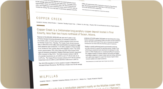 C O P P E R C R E E K Location: Arizona, United States | Operator: Faraday Copper Corp. | Metals: Cu, Mo & Ag | Royalty: NSR: 1% and Production Decision Royalty Payments Copper Creek is a 3-kilometer-long porphyry copper deposit located in Pinal County, less than two hours northeast of Tucson, Arizona. Payment of $3,000,000 ($500,000 per year over 6 years) is due to Franco-Nevada following achievement of commercial production of minerals within a 5-mile radius of certain patented claims now held by Faraday Copper Corp. (Faraday). The Copper Creek mineral resource area is within this 5-mile radius and would therefore be expected to trigger such payments upon production. A 1% NSR is payable to Franco-Nevada on all production from certain areas within Faraday’s control. The royalty covers approximately 70% of the Globe and 50% of the Copper Prince open pit resources as reported in Faraday’s Preliminary Economic Assessment (PEA) released in May 2023. The Globe resource contains 9.88 Mt of sulphide/transitional ore at 0.40% Cu and 2.71 Mt of oxide ore at 0.37% Cu. The Copper Prince resource contains 20.72 Mt of sulphide/ transitional ore at 0.45% Cu and 5.89 Mt of oxide ore at 0.36% Cu. The 2023 PEA reported 4.2 billion pounds of copper in Measured and Indicated Mineral Resources. The PEA has a 32-year mine life with average production of 51,100 payable CuEq tonnes per year during active mining. Capital investment is estimated at $798 million with a two-year construction period. The Globe and Copper Prince open pit deposits are currently scheduled to be mined within the first three years of operations. Faraday is currently performing baseline environmental monitoring and data collection to support the permitting process. Faraday is also performing an assessment and classification of waterways for a 404 permit. In 2024, Faraday plans on completing the Phase III exploration drill program focused on resource expansion and testing new targets, metallurgical programs to support coarser grind and tailings optimization and a gold assay program to support the inclusion of gold in future resource updates and project economics. Franco-Nevada has not included Copper Creek in Royalty Ounce estimates M I L P I L L A S Location: Mexico | Operator: Industrias Peñoles, S.A.B. de C.V. | Metals: Cu | Royalty: Production Payment Franco-Nevada has a production payment royalty on the Milpillas copper mine in Sonora, Mexico operated by Industrias Peñoles, S.A.B. de C.V. (“Peñoles”). The royalty is $0.04/lb of copper produced, if the price of copper is above $1.20/lb. The royalty ground covers an estimated 30 km 2 . The project is an underground copper mine and heap leach operation and was acquired by Franco-Nevada in September 2020 as part of a portfolio of 24 royalties from Freeport-McMoRan Inc. Production resumed in mid-2022 after active mining was paused due to low copper prices in Q2 2020. In 2023 Franco-Nevada received $1.1 million in royalty payments from Milpillas. Franco-Nevada has not included Milpillas in Royalty Ounce estimates E A G L E P I C H E R Location: Nevada, United States | Operator: US Silica | Metals: De | Royalty: Production Payment EaglePicher is a diatomaceous earth operation in Pershing County, Nevada, located about 23 miles northwest of Lovelock. The royalty is based on a fixed payment per ton which fluctuates based on the average sales price from the prior year’s sales. The royalty covers approximately 15 km 2 of checkerboard lands. The intervening lands are public and EaglePicher holds unpatented placer claims on those lands as needed for mining. The mine has been in continuous operation since the 1950s with approximately 65% of production coming from Franco-Nevada land. The revenue received from EaglePicher in 2022 and 2023 was $319,000 and $424,000, respectively. Franco-Nevada has not included EaglePicher in Royalty Ounce estimates TSX / NYSE: FNV 102 ★ Franco-Nevada Corporation Other Mining