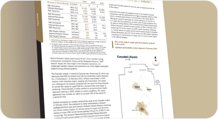C A S C A B E L ( A L P A L A ) Location: Ecuador, South America | Operator: SolGold plc | Precious Metals: Au, Cu, Ag | Royalty: NSR: 1% In 2020, Franco-Nevada acquired a 1% NSR on the Cascabel copper-gold-silver project located in northern Ecuador being advanced by SolGold plc (“SolGold”). 2023 2022 2021 Revenue to Franco-Nevada ($ million) $ − $ – $ – M&I Resources (Mlbs Cu)¹ 27,337 24,626 22,994 Inferred Resources (Mlbs Cu)¹ 4,409 3,439 4,012 P&P Reserves (Mlbs Cu)¹ 7,055 7,187 – M&I Resources (koz Au) 1 31,200 24,850 22,900 Inferred Resources (koz Au) 1 5,400 2,520 3,140 P&P Reserves (koz Au) 1 9,400 9,370 – M&I Resources (Moz Ag) 1 91.3 92.2 92.2 Inferred Resources (Moz Ag) 1 11.0 10.6 10.6 P&P Reserves (Moz Ag) 1 28.0 30.0 – M&I Royalty Ounces (millions) 1,2 769 724 621 Inferred Royalty Ounces (millions) 1 127 91 99 P&P Royalty Ounces (millions) 1 213 233 – 1 Please refer to the tables on pages 118-124 for a breakout of grade and tonnages by Mineral Resource category; all M&I categories are inclusive of Mineral Reserves 2 For Royalty Ounce calculation, Franco-Nevada estimates 100% of the Mineral Resources and Mineral Reserves are subject to our royalty interest and estimates a rate of 1.0% (0.85% for copper Royalty Ounces which factors a NSR smelting charge of 15%). Copper has been converted to Royalty Ounces assuming $3.75 per pound ($4.00 per pound in 2022) and silver has been converted to Royalty Ounces assuming $1,950/oz gold and $22.50/oz silver ($1,800/oz gold and $21.00/oz silver in 2022, $1,800/oz gold and $23.00/oz silver in 2021) Franco-Nevada’s royalty covers nearly 50 km 2 of the Cascabel mining concessions including the Alpala and the Tandayama-America (“TAM”) deposit. Alpala, the main target in the Cascabel concession, is a copper-gold porphyry deposit and represents one of the largest copper-gold projects being advanced globally. The Cascabel project is owned by Exploraciones Novamining SA, which was previously held 85% by SolGold and 15% by Cornerstone Capital Resource Inc. (“Cornerstone”). In February 2023, SolGold consolidated a 100% interest in the Cascabel project, merging with Cornerstone. The royalty is in reference to all minerals produced with the option for Franco-Nevada to convert the royalty to a gold NSR for a period of time once Alpala is producing. Franco-Nevada is further entitled to receive minimum royalty payments starting in 2028, subject to certain conditions. The royalty agreement also includes an option to buy back 50% of the royalty for a period of time. SolGold announced an updated prefeasibility study on the Cascabel project in February 2024. The prefeasibility study contemplates a phased underground block cave and outlined a Probable Mineral Reserve containing 9.4 million ounces of gold, 3.2 million tonnes of copper, and 28 million ounces of silver (540 million tonnes grading 0.54 g/t Au, 0.60% Cu and 1.6 g/t Ag). The inclusive Measured and Indicated Mineral Resource comprised 3,013 million tonnes at 0.52% CuEq for 26.8 million ounces of gold, 10.7 million tonnes of copper, and 91.3 million ounces of silver. The prefeasibility study contemplates an initial 28-year mine life, which reflects the exploitation of only 18% of the Alpala measured and indicated mineral resource. The initial capital cost has decreased compared to previous scenarios, as the phased approach gradually scales up operations. After a ramp-up period of approximately two years, the initial block cave will achieve a production rate of 12 Mtpa. The initial cave will extract high-grade ore, averaging approximately 1.45% CuEq for the first ten years of production. The extraction of this high-grade material will not sterilize the surrounding lower-grade ore. The mining operations will be expanded by an additional 12Mtpa, increasing to a total annual production rate of 24Mtpa in year 6. An average of approximately 123,000 tonnes of copper, 277,000 ounces of gold and 794,000 ounces of silver per year is expected over the life of the project. Exploration has yielded encouraging results on the broader Cascabel concessions with the identification of a highly mineralized system at TAM, which is located approximately 6 km northeast of the Alpala deposit, offering an excellent opportunity to provide additional mill feed for up to 7 years and the potential for an earlier start of metal production from an open pit mining method. TAM is covered by the Franco-Nevada royalty. SolGold declared a updated mineral resource at TAM in February 2024 comprising 722 million tonnes at 0.36% copper equivalent containing 1.7 million tonnes of copper and 4.5 million ounces of gold in Indicated Mineral Resources, plus 247 million tonnes at 0.35% copper equivalent containing 0.5 million tonnes of copper and 1.6 million ounces of gold in the Inferred category. One of the largest copper-gold development projects in the world Updated prefeasibility study released in February 2024 0.4% Copper Equivalent 1.0% Copper Equivalent Royalty Claim Area 0.1% Copper Equivalent Pacific Ocean Argentina Bolivia Peru Brazil Colombia Chile Cascabel Equador Alpala Rocafuerte Alpala Camp Tandayama America Frontier Transverse Hwy Aguinaga Site Office 1% NSR Cascabel (Alpala) 1% NSR kilometer 1 0 N TSX / NYSE: FNV 36 ★ Franco-Nevada Corporation South America