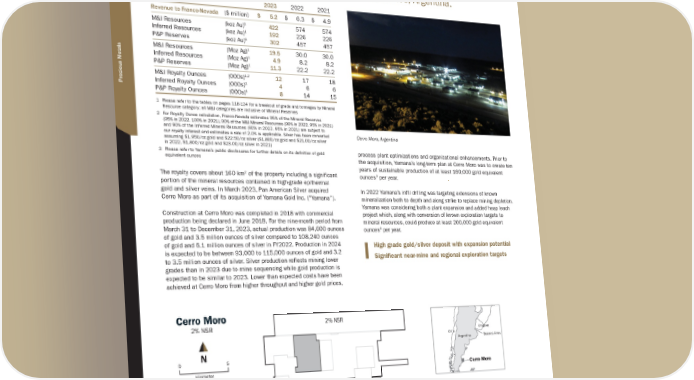 C E R R O M O R O Location: Argentina, South America | Operator: Pan American Silver Corp. | Precious Metals: Au & Ag | Royalty: NSR: 2% Franco-Nevada has a 2% NSR on the Cerro Moro mine operated by Pan American Silver Corp. (“Pan American Silver”) in Santa Cruz province, Argentina. 2023 2022 2021 Revenue to Franco-Nevada ($ million) $ 5.2 $ 6.3 $ 4.9 M&I Resources (koz Au) 1 422 574 574 Inferred Resources (koz Au) 1 192 226 226 P&P Reserves (koz Au) 1 302 457 457 M&I Resources (Moz Ag) 1 19.5 30.0 30.0 Inferred Resources (Moz Ag) 1 4.9 8.2 8.2 P&P Reserves (Moz Ag) 1 11.3 22.2 22.2 M&I Royalty Ounces (000s) 1,2 12 17 18 Inferred Royalty Ounces (000s) 1 4 6 6 P&P Royalty Ounces (000s) 1 8 14 15 1 Please refer to the tables on pages 118-124 for a breakout of grade and tonnages by Mineral Resource category; all M&I categories are inclusive of Mineral Reserves 2 For Royalty Ounce calculation, Franco-Nevada estimates 95% of the Mineral Reserves (95% in 2022, 100% in 2021), 90% of the M&I Mineral Resources (90% in 2022, 95% in 2021) and 90% of the Inferred Mineral Resources (90% in 2022, 95% in 2021) are subject to our royalty interest and estimates a rate of 2.0% is applicable. Silver has been converted assuming $1,950/oz gold and $22.50/oz silver ($1,800/oz gold and $21.00/oz silver in 2022, $1,800/oz gold and $23.00/oz silver in 2021) 3 Please refer to Yamana’s public disclosures for further details on its definition of gold equivalent ounces The royalty covers about 160 km 2 of the property including a significant portion of the mineral resources contained in high-grade epithermal gold and silver veins. In March 2023, Pan American Silver acquired Cerro Moro as part of its acquisition of Yamana Gold Inc. (“Yamana”). Construction at Cerro Moro was completed in 2018 with commercial production being declared in June 2018. For the nine-month period from March 31 to December 31, 2023, actual production was 84,600 ounces of gold and 3.5 million ounces of silver compared to 108,240 ounces of gold and 6.1 million ounces of silver in FY2022. Production in 2024 is expected to be between 93,000 to 115,000 ounces of gold and 3.2 to 3.5 million ounces of silver. Silver production reflects mining lower grades than in 2023 due to mine sequencing while gold production is expected to be similar to 2023. Lower than expected costs have been achieved at Cerro Moro from higher throughput and higher gold prices, process plant optimizations and organizational enhancements. Prior to the acquisition, Yamana’s long-term plan at Cerro Moro was to create ten years of sustainable production of at least 160,000 gold equivalent ounces 3 per year. In 2022 Yamana’s infill drilling was targeting extensions of known mineralization both to depth and along strike to replace mining depletion. Yamana was considering both a plant expansion and added heap leach project which, along with conversion of known exploration targets to mineral resources, could produce at least 200,000 gold equivalent ounces 3 per year. High grade gold/silver deposit with expansion potential Significant near-mine and regional exploration targets kilometer 5 0 Cerro Moro 2% NSR Carla Michelle Zoe Deborah Martina Tres Lomas Esperanza Loma Escondida Escondida Nini Nini Ext Natalia Natalia NW Plant Buenos Aires Cerro Moro Chile Argentina Uruguay Elsa 2% NSR FNV Royalties Excluded from Royalty Deposits N Cerro Moro, Argentina TSX / NYSE: FNV 34 ★ Franco-Nevada Corporation South America
