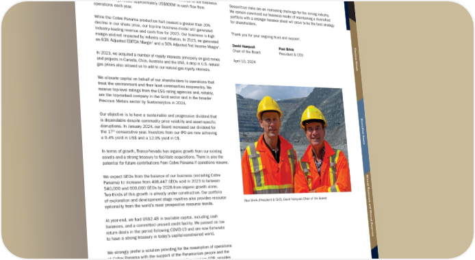 D E A R S T A K E H O L D E R S Our objective is to build a diversified, top-line business that is a hedge against market volatility and is exposed to the exploration success of the mining industry. This approach has resulted in a history of leading returns, but in late 2023 we were challenged by the unprecedented production halt at Cobre Panama. Despite the hopefully temporary production halt at this asset, our business remains robust. We finished the year with no debt and US$1.4B of cash. The balance of our business continues to generate approximately US$800M in cash flow from operations each year. While the Cobre Panama production halt caused a greater than 20% decline in our share price, our top-line business model still generated industry-leading revenue and cash flow for 2023. Our business is high margin and not impacted by industry cost inflation. In 2023, we generated an 83% Adjusted EBITDA Margin 1 and a 56% Adjusted Net Income Margin 1 . In 2023, we acquired a number of royalty interests principally on gold mines and projects in Canada, Chile, Australia and the USA. A drop in U.S. natural gas prices also allowed us to add to our natural gas royalty interests. We allocate capital on behalf of our shareholders to operations that treat the environment and their host communities responsibly. We receive top-level ratings from the ESG rating agencies and, notably, are the top-ranked company in the Gold sector and in the broader Precious Metals sector by Sustainalytics in 2024. Our objective is to have a sustainable and progressive dividend that is dependable despite commodity price volatility and asset-specific disruptions. In January 2024, our Board increased our dividend for the 17 th consecutive year. Investors from our IPO are now achieving a 9.4% yield in US$ and a 12.9% yield in C$. In terms of growth, Franco-Nevada has organic growth from our existing assets and a strong treasury to facilitate acquisitions. There is also the potential for future contributions from Cobre Panama if operations resume. We expect GEOs from the balance of our business (excluding Cobre Panama) to increase from 498,447 GEOs sold in 2023 to between 540,000 and 600,000 GEOs by 2028 from organic growth alone. Two-thirds of this growth is already under construction. Our portfolio of exploration and development stage royalties also provides resource optionality from the world’s most prospective resource trends. At year-end, we had US$2.4B in available capital, including cash balances, and a committed unused credit facility. We passed on low return deals in the period following COVID-19 and are now fortunate to have a strong treasury in today’s capital-constrained world. We strongly prefer a solution providing for the resumption of operations at Cobre Panama with the support of the Panamanian people and the Government. The mine contributes 4-5% of Panamanian GDP, provides valued jobs to 7,000 direct employees, furnishes support to its local communities and has a strong environmental performance record. The operation has the potential to generate substantial benefits for Panama over several generations. We operate our business with a small team of 40 people and have kept overhead low while our asset base has grown substantially. Our success is a result of a highly capable team and the guidance of an experienced and engaged Board of Directors. They have a material stake in the business and think like owners. Geopolitical risks are an increasing challenge for the mining industry. We remain convinced our business model of maintaining a diversified portfolio with a stronger balance sheet will prove to be the best strategy for shareholders. Thank you for your ongoing trust and support. David Harquail Paul Brink Chair of the Board President & CEO April 10, 2024 Paul Brink (President & CEO), David Harquail (Chair of the Board) 1 Adjusted EBITDA Margin and Adjusted Net Income Margin are Non-GAAP Financial Measures. Refer to the “Non-GAAP Financial Measures” section starting on page 132 of this Asset Handbook Franco-Nevada Corporation ★ 5 TSX / NYSE: FNV Overview