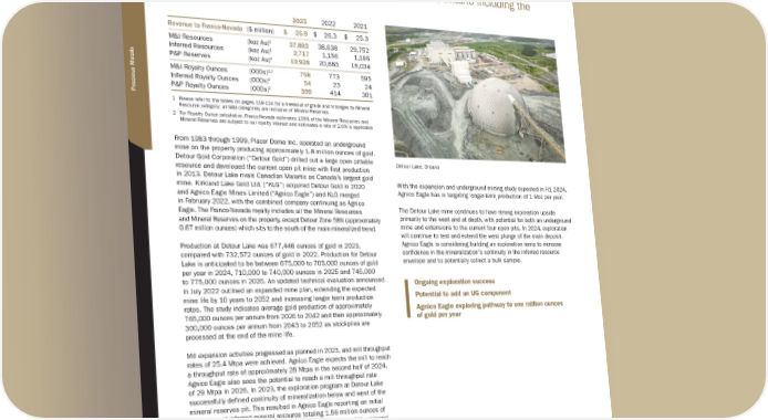 D E T O U R L A K E Location: Ontario, Canada | Operator: Agnico Eagle Mines Limited | Precious Metals: Au | Royalty: NSR: 2% Franco-Nevada has a 2% NSR royalty that covers an area of 140 km 2 of the Abitibi greenstone belt located 185 km northeast of Cochrane, Ontario including the Detour Lake mine. 2023 2022 2021 Revenue to Franco-Nevada ($ million) $ 25.9 $ 26.3 $ 25.3 M&I Resources (koz Au) 1 37,883 38,638 29,752 Inferred Resources (koz Au) 1 2,717 1,156 1,196 P&P Reserves (koz Au) 1 19,928 20,683 15,034 M&I Royalty Ounces (000s) 1,2 758 773 595 Inferred Royalty Ounces (000s) 2 54 23 24 P&P Royalty Ounces (000s) 2 399 414 301 1 Please refer to the tables on pages 118-124 for a breakout of grade and tonnages by Mineral Resource category; all M&I categories are inclusive of Mineral Reserves 2 For Royalty Ounce calculation, Franco-Nevada estimates 100% of the Mineral Resources and Mineral Reserves are subject to our royalty interest and estimates a rate of 2.0% is applicable From 1983 through 1999, Placer Dome Inc. operated an underground mine on the property producing approximately 1.8 million ounces of gold. Detour Gold Corporation (“Detour Gold”) drilled out a large open pittable resource and developed the current open pit mine with first production in 2013. Detour Lake rivals Canadian Malartic as Canada’s largest gold mine. Kirkland Lake Gold Ltd. (“KLG”) acquired Detour Gold in 2020 and Agnico Eagle Mines Limited (“Agnico Eagle”) and KLG merged in February 2022, with the combined company continuing as Agnico Eagle. The Franco-Nevada royalty includes all the Mineral Resources and Mineral Reserves on the property, except Detour Zone 58N (approximately 0.67 million ounces) which sits to the south of the main mineralized trend. Production at Detour Lake was 677,446 ounces of gold in 2023, compared with 732,572 ounces of gold in 2022. Production for Detour Lake is anticipated to be between 675,000 to 705,000 ounces of gold per year in 2024, 710,000 to 740,000 ounces in 2025 and 745,000 to 775,000 ounces in 2026. An updated technical evaluation announced in July 2022 outlined an expanded mine plan, extending the expected mine life by 10 years to 2052 and increasing longer term production rates. The study indicates average gold production of approximately 765,000 ounces per annum from 2026 to 2042 and then approximately 300,000 ounces per annum from 2043 to 2052 as stockpiles are processed at the end of the mine life. Mill expansion activities progressed as planned in 2023, and mill throughput rates of 25.4 Mtpa were achieved. Agnico Eagle expects the mill to reach a throughput rate of approximately 28 Mtpa in the second half of 2024. Agnico Eagle also sees the potential to reach a mill throughput rate of 29 Mtpa in 2026. In 2023, the exploration program at Detour Lake successfully defined continuity of mineralization below and west of the mineral reserves pit. This resulted in Agnico Eagle reporting an initial underground inferred mineral resource totaling 1.56 million ounces of gold (21.8 million tonnes grading 2.23 g/t gold) outside of the mineral resource pit. Work is ongoing to determine the optimal transition point from open pit to underground mining. With the expansion and underground mining study expected in H1 2024, Agnico Eagle has is targeting longer-term production of 1 Moz per year. The Detour Lake mine continues to have strong exploration upside primarily to the west and at depth, with potential for both an underground mine and extensions to the current four open pits. In 2024, exploration will continue to test and extend the west plunge of the main deposit. Agnico Eagle is considering building an exploration ramp to increase confidence in the mineralization's continuity in the inferred resource envelope and to potentially collect a bulk sample. Detour Lake, Ontario Ongoing exploration success Potential to add an UG component Agnico Eagle exploring pathway to one million ounces of gold per year TSX / NYSE: FNV 54 ★ Franco-Nevada Corporation Canada
