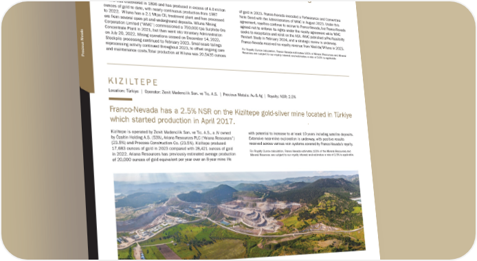 Kiziltepe, Türkiye M A T I L D A ( W I L U N A ) Location: Australia | Operator: Wiluna Mining Corporation Limited | Precious Metals: Au | Royalty: NSR: 3.6% Franco-Nevada holds a 3.6% NSR royalty on all gold production from the Matilda/Wiluna Gold Project located in Western Australia, covering all of the 1,150 km 2 property. Wiluna was discovered in 1896 and has produced in excess of 4.0 million ounces of gold to date, with nearly continuous production from 1987 to 2022. Wiluna has a 2.1 Mtpa CIL treatment plant and has processed ore from several open pit and underground deposits. Wiluna Mining Corporation Limited (“WMC”) commissioned a 750,000 tpa Sulphide Ore Concentrate Plant in 2021, but then went into Voluntary Administration on July 20, 2022. Mining operations ceased on December 14, 2022. Stockpile processing continued to February 2023. Small-scale tailings reprocessing activity continued throughout 2023, to offset ongoing care and maintenance costs.Total production at Wiluna was 20,5435 ounces of gold in 2023. Franco-Nevada executed a Forbearance and Convertible Note Deed with the Administrators of WMC in August 2023. Under this agreement, royalties continue to accrue to Franco-Nevada, but Franco-Nevada agreed not to enforce its rights under the royalty agreement while WMC seeks to recapitalize and relist on the ASX. WMC published a Pre-Feasibility Restart Study in February 2024, and a strategic review is underway. Franco-Nevada received no royalty revenue from Matilda/Wiluna in 2023. For Royalty Ounce calculation, Franco-Nevada estimates 100% of Mineral Resources and Mineral Reserves are subject to our royalty interest and estimates a rate of 3.6% is applicable K I Z I L T E P E Location: Türkiye | Operator: Zenit Madencilik San. ve Tic. A.S. | Precious Metals: Au & Ag | Royalty: NSR: 2.5% Franco-Nevada has a 2.5% NSR on the Kiziltepe gold - silver mine located in Türkiye which started production in April 2017. Kiziltepe is operated by Zenit Madencilik San. ve Tic. A.S., a JV owned by Özaltin Holding A.S. (53%), Ariana Resources PLC (“Ariana Resources”) (23.5%) and Proccea Construction Co. (23.5%). Kiziltepe produced 17,683 ounces of gold in 2023 compared with 28,421 ounces of gold in 2022. Ariana Resources has previously estimated average production of 20,000 ounces of gold equivalent per year over an 8-year mine life with potential to increase to at least 10 years including satellite deposits. Extensive near-mine exploration is underway, with positive results received across various vein systems covered by Franco-Nevada’s royalty. For Royalty Ounce calculation, Franco-Nevada estimates 100% of the Mineral Resources and Mineral Reserves are subject to our royalty interest and estimates a rate of 2.5% is applicable. TSX / NYSE: FNV 82 ★ Franco-Nevada Corporation Rest of World