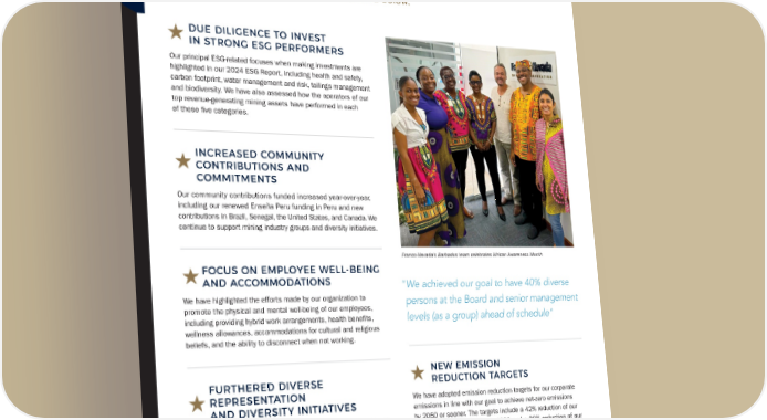 E N V I R O N M E N T A L , S O C I A L A N D G O V E R N A N C E H I G H L I G H T S Franco-Nevada’s 2024 ESG Report is available on our website. Highlights from the report are summarized below. DUE DILIGENCE TO INVEST IN STRONG ESG PERFORMERS Our principal ESG-related focuses when making investments are highlighted in our 2024 ESG Report, including health and safety, carbon footprint, water management and risk, tailings management and biodiversity. We have also assessed how the operators of our top revenue-generating mining assets have performed in each of these five categories. INCREASED COMMUNITY CONTRIBUTIONS AND COMMITMENTS Our community contributions funded increased year-over-year, including our renewed Enseña Peru funding in Peru and new contributions in Brazil, Senegal, the United States, and Canada. We continue to support mining industry groups and diversity initiatives. FOCUS ON EMPLOYEE WELL-BEING AND ACCOMMODATIONS We have highlighted the efforts made by our organization to promote the physical and mental well-being of our employees, including providing hybrid work arrangements, health benefits, wellness allowances, accommodations for cultural and religious beliefs, and the ability to disconnect when not working. FURTHERED DIVERSE REPRESENTATION AND DIVERSITY INITIATIVES We achieved our goal to have 40% diverse persons at the Board and senior management levels (as a group) ahead of schedule. The number of Franco-Nevada Diversity Scholarship awards increased in 2023, with five new students from four Canadian universities receiving scholarships. Franco-Nevada’s Barbados team celebrates African Awareness Month "We achieved our goal to have 40% diverse persons at the Board and senior management levels (as a group) ahead of schedule" NEW EMISSION REDUCTION TARGETS We have adopted emission reduction targets for our corporate emissions in line with our goal to achieve net-zero emissions by 2050 or sooner. The targets include a 42% reduction of our Scope 1 and 2 emissions by 2030 and a 30% reduction of our overall corporate emissions (Scope 1, 2 and 3, excluding financed emissions) by 2030, each from a 2023 base year. We have advanced the implementation of measures and programs to reduce our carbon footprint in furtherance of our emission reduction targets. TSX / NYSE: FNV 22 ★ Franco-Nevada Corporation Overview