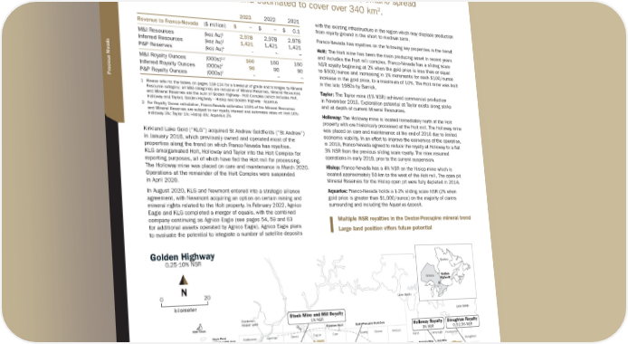 G O L D E N H I G H W A Y Location: Ontario, Canada | Operator: Agnico Eagle Mines Limited | Precious Metals: Au | Royalty: NSR: 0.25-10% Franco-Nevada has multiple NSR royalties ranging from 0.25 to 10% over the Destor-Porcupine mineral trend just east of Timmins, Ontario spread over more than 120 km and estimated to cover over 340 km 2 . 2023 2022 2021 Revenue to Franco-Nevada ($ million) $ − $ – $ 0.1 M&I Resources (koz Au) 1 2,978 2,978 2,978 Inferred Resources (koz Au) 1 1,421 1,421 1,421 P&P Reserves (koz Au) 1 – – – M&I Royalty Ounces (000s) 1,2 160 160 160 Inferred Royalty Ounces (000s) 2 90 90 90 P&P Royalty Ounces (000s) 2 – – – 1 Please refer to the tables on pages 118-124 for a breakout of grade and tonnages by Mineral Resource category; all M&I categories are inclusive of Mineral Reserves. Mineral Resources and Mineral Reserves are the sum of Golden Highway - Holt Complex (which includes Holt, Holloway and Taylor), Golden Highway – Hislop and Golden Highway - Aquarius 2 For Royalty Ounce calculation, Franco-Nevada estimates 100% of the Mineral Resources and Mineral Reserves are subject to our royalty interest and estimates rates of: Holt 10%; Holloway 3%; Taylor 1%; Hislop 4%; Aquarius 2% Kirkland Lake Gold (“KLG”) acquired St Andrew Goldfields (“St Andrew”) in January 2016, which previously owned and operated most of the properties along the trend on which Franco-Nevada has royalties. KLG amalgamated Holt, Holloway and Taylor into the Holt Complex for reporting purposes, all of which have fed the Holt mill for processing. The Holloway mine was placed on care and maintenance in March 2020. Operations at the remainder of the Holt Complex were suspended in April 2020. In August 2020, KLG and Newmont entered into a strategic alliance agreement, with Newmont acquiring an option on certain mining and mineral rights related to the Holt property. In February 2022, Agnico Eagle and KLG completed a merger of equals, with the combined company continuing as Agnico Eagle (see pages 54, 59 and 63 for additional assets operated by Agnico Eagle). Agnico Eagle plans to evaluate the potential to integrate a number of satellite deposits with the existing infrastructure in the region which may displace production from royalty ground in the short to medium term. Franco-Nevada has royalties on the following key properties in the trend: Holt: The Holt mine has been the main producing asset in recent years and includes the Holt mill complex. Franco-Nevada has a sliding scale NSR royalty beginning at 2% when the gold price is less than or equal to $500/ounce and increasing in 1% increments for each $100/ounce increase in the gold price, to a maximum of 10%. The Holt mine was built in the late 1980s by Barrick. Taylor: The Taylor mine (1% NSR) achieved commercial production in November 2015. Exploration potential at Taylor exists along strike and at depth of current Mineral Resources. Holloway: The Holloway mine is located immediately north of the Holt property with ore historically processed at the Holt mill. The Holloway mine was placed on care and maintenance at the end of 2016 due to limited economic viability. In an effort to improve the economics of the operation, in 2019, Franco-Nevada agreed to reduce the royalty at Holloway to a flat 3% NSR from the previous sliding scale royalty. The mine resumed operations in early 2019, prior to the current suspension. Hislop: Franco-Nevada has a 4% NSR on the Hislop mine which is located approximately 50 km to the west of the Holt mill. The open pit Mineral Reserves for the Hislop open pit were fully depleted in 2014. Aquarius: Franco-Nevada holds a 1-2% sliding scale NSR (2% when gold price is greater than $1,000/ounce) on the majority of claims surrounding and including the Aquarius deposit. Multiple NSR royalties in the Destor-Porcupine mineral trend Large land position offers future potential 101 Stoughton Matheson Porcupine Timmins Frederick House Lake Night Hawk Lake Kenogamisis Lake Holt Mine Jonpol Ross Mine Apollo Black Fox Ludgate Porcupine Peninsula Royal Oak Bell Creek Owl Creek Delnite Aunor Paymaster Dome McIntyre Hollinger Pamour #1 Matheson Stock Taylor Cody Macklem Bond Currie Carr Beatty Bowman Hislop Guibord 11 11 ONR Destor-Porcupine Fault Zone Pipestone Fault Cook Barnet Thackeray Harker Garrison Rand Michaud Munro McCool Frecheville Lamplugh Lake Abitibi 101 Marriot Holloway Holloway Mine Broulan Reef Hallnor Hoyle Pond Kinross 1060 Zone Kidd Creek Golden Highway 0.25-10% NSR kilometer 20 0 N Present or past producing mine Holloway Royalty 3% NSR 0.5-2.5% NSR Stoughton Royalty 1-2% NSR Aquarius Royalty 1% NSR Taylor Royalty 4% NSR Hislop Royalty Central Timmins Royalty Claims 0.25-1% NSR 1% NSR Stock Mine and Mill Royalty Holt Royalty Sliding scale Zone 7 Royalty Sliding scale German Lake Abitibi Quebec Ontario Golden Highway TSX / NYSE: FNV 68 ★ Franco-Nevada Corporation Canada