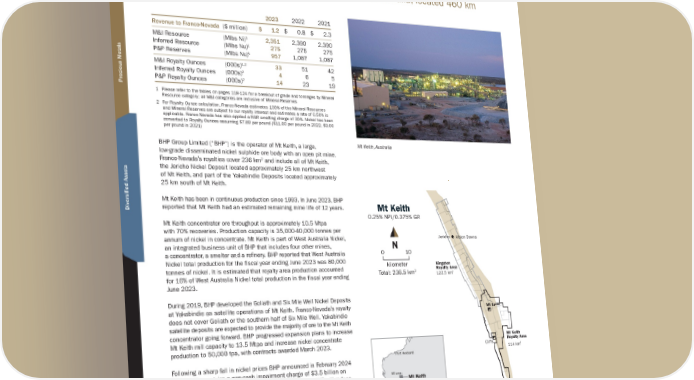 M T K E I T H Location: Australia | Operator: BHP Group Limited | Metals: Ni | Royalty: NPI: 0.25% / GR: 0.375% Franco-Nevada has a 0.375% gross royalty and a 0.25% NPI royalty on lands including the Mt Keith nickel operation in Western Australia, located 460 km north of Kalgoorlie. 2023 2022 2021 Revenue to Franco-Nevada ($ million) $ 1.2 $ 0.8 $ 2.3 M&I Resource (Mlbs Ni) 1 2,351 2,390 2,390 Inferred Resource (Mlbs Nu) 1 275 275 275 P&P Reserves (Mlbs Nu) 1 957 1,087 1,087 M&I Royalty Ounces (000s) 1,2 33 51 42 Inferred Royalty Ounces (000s) 2 4 6 5 P&P Royalty Ounces (000s) 2 14 23 19 1 Please refer to the tables on pages 118-124 for a breakout of grade and tonnages by Mineral Resource category; all M&I categories are inclusive of Mineral Reserves 2 For Royalty Ounce calculation, Franco-Nevada estimates 100% of the Mineral Resources and Mineral Reserves are subject to our royalty interest and estimates a rate of 0.50% is applicable. Franco-Nevada has also applied a NSR smelting charge of 30%. Nickel has been converted to Royalty Ounces assuming $7.89 per pound ($11.00 per pound in 2022, $9.00 per pound in 2021) BHP Group Limited (“BHP”) is the operator of Mt Keith, a large, low-grade disseminated nickel sulphide ore body with an open pit mine. Franco-Nevada’s royalties cover 236 km 2 and include all of Mt Keith, the Jericho Nickel Deposit located approximately 25 km northwest of Mt Keith, and part of the Yakabindie Deposits located approximately 25 km south of Mt Keith. Mt Keith has been in continuous production since 1993. In June 2023, BHP reported that Mt Keith had an estimated remaining mine life of 12 years. Mt Keith concentrator ore throughput is approximately 10.5 Mtpa with 70% recoveries. Production capacity is 35,000-40,000 tonnes per annum of nickel in concentrate. Mt Keith is part of West Australia Nickel, an integrated business unit of BHP that includes four other mines, a concentrator, a smelter and a refinery. BHP reported that West Australia Nickel total production for the fiscal year ending June 2023 was 80,000 tonnes of nickel. It is estimated that royalty area production accounted for 16% of West Australia Nickel total production in the fiscal year ending June 2023. During 2019, BHP developed the Goliath and Six Mile Well Nickel Deposits at Yakabindie as satellite operations of Mt Keith. Franco-Nevada’s royalty does not cover Goliath or the southern half of Six Mile Well. Yakabindie satellite deposits are expected to provide the majority of ore to the Mt Keith concentrator going forward. BHP progressed expansion plans to increase Mt Keith mill capacity to 13.5 Mtpa and increase nickel concentrate production to 50,000 tpa, with contracts awarded March 2023. Following a sharp fall in nickel prices BHP announced in February 2024 that it will recognize a non-cash impairment charge of $3.5 billion on the carrying value of West Australia Nickel. In addition, BHP will reduce discretionary expenditures and review capital plans. BHP may place West Australia Nickel into a care and maintenance. 12-year reserve life at Mt Keith BHP may place West Australia Nickel in care and maintenance while Ni prices are low Mt Keith 0.25% NPI/0.375% GR Albion Downs Jericho Cliffs Yakabindie Kingston Royalty Area 122.5 km 2 Mt Keith Royalty Area 114 km 2 Mt Keith Perth Port Hedland Kalgoorlie Wiluna N Mt Keith BRAZIL BOLIVIA PARAGUAY Total: 236.5 km 2 kilometer 10 0 N Mt Keith, Australia TSX / NYSE: FNV 100 ★ Franco-Nevada Corporation Other Mining