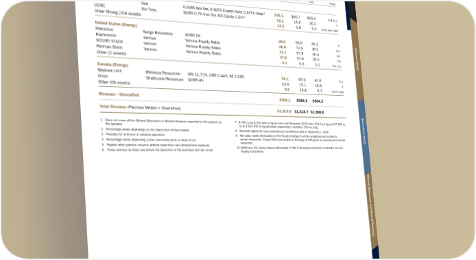 A S S E T P O R T F O L I O Diversified 1 Does not cover all the Mineral Resources or Mineral Reserves reported for the property by the operator 2 Percentage varies depending on the claim block of the property 3 Provides for minimum or advance payments 4 Percentage varies depending on the commodity price or value of ore 5 Payable after operator recovers defined exploration and development expenses 6 These revenue numbers are before the deduction of the purchase cost per ounce 7 8,760 oz Au & 291,000 oz Ag per year until December 2025; then, 63% Au & Ag until 87,600 oz Au & 2,910,000 oz Ag delivered, respectively; thereafter, 25% Au & Ag 8 Sabodala agreement was amended with an effective date of September 1, 2020 9 Net sales royalty attributable to FNV Royalty holding on certain properties and subject to certain thresholds. Copper/Gold rate applies to Sossego at 50% given its previous joint venture ownership 10 GORR and IOC equity interest attributable to FNV 9.9% equity ownership of Labrador Iron Ore Royalty Corporation Revenue ($ millions) Asset Operator Interest and % 2023 2022 2021 Notes Diversified Vale Vale 0.264% Iron Ore, 0.367% Copper/Gold, 0.147% Other 9 $35.1 $40.7 $59.4 Px3, Ex1 LIORC Rio Tinto GORR 0.7% Iron Ore, IOC Equity 1.5% 10 12.1 14.8 30.2 P Other Mining (104 assets) 13.2 6.9 5.2 Px10, Ax9, Ex85 United States (Energy) Marcellus Range Resources GORR 1% 28.0 56.5 36.1 P Haynesville Various Various Royalty Rates 26.0 72.9 38.5 Px2 SCOOP/STACK Various Various Royalty Rates 33.1 57.8 36.4 Px3 Permian Basin Various Various Royalty Rates 47.6 52.6 35.0 Px2 Other (2 assets) 0.3 0.3 0.2 Px1, Ex1 Canada (Energy) Weyburn Unit Whitecap Resources NRI 11.71%, ORR 0.44%, WI 2.56% 50.1 65.0 43.8 Px3 Orion Strathcona Resources GORR 4% 13.6 15.1 10.8 P Other (69 assets) 9.0 13.4 8.7 Px43, Ex26 Revenue – Diversified $268.1 $396.0 $304.3 Total Revenue (Precious Metals + Diversified) $1,219.0 $1,315.7 $1,300.0 Franco-Nevada Corporation ★ 13 TSX / NYSE: FNV Overview