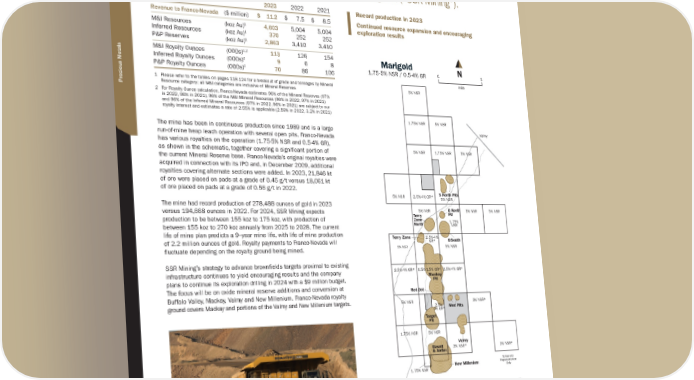 United States MARIGOLD w Location: Nevada, United States | Operator: SSR Mining Inc. | Precious Metals: Au | Royalty: NSR: 1.75-5% / GR: 0.5-4% vie Over The Marigold mine is located 64 km southeast of Winnemucca, Nevada on the Battle Mountain-Eureka Trend and is operated by SSR Mining Inc. (“SSR Mining”). 2023 2022 2021 Record production in 2023 Revenue to Franco-Nevada ($ million) $ 11.2 $ 7.5 $ 8.5 Continued resource expansion and encouraging M&I Resources (koz Au)1 4,603 5,004 5,004 exploration results Inferred Resources (koz Au)1 370 252 252 P&P Reserves (koz Au)1 2,863 3,410 3,410 1,2 M&I Royalty Ounces (000s) 113 126 154 Marigold 2 Inferred Royalty Ounces (000s) 9 6 8 1.75-5% NSR / 0.5-4% GR 0 N 1 2 P&P Royalty Ounces (000s) 70 86 106 mile 1 Please refer to the tables on pages 118-124 for a breakout of grade and tonnages by Mineral 5% NSR Precious Metals Resource category; all M&I categories are inclusive of Mineral Reserves 2 For Royalty Ounce calculation, Franco-Nevada estimates 96% of the Mineral Reserves (97% in 2022, 96% in 2021), 96% of the M&I Mineral Resources (96% in 2022, 97% in 2021) and 96% of the Inferred Mineral Resources (97% in 2022, 96% in 2021) are subject to our royalty interest and estimates a rate of 2.55% is applicable (2.59% in 2022, 3.2% in 2021) 1.75% NSR 5% NSR The mine has been in continuous production since 1989 and is a large Valmy run-of-mine heap leach operation with several open pits. Franco-Nevada has various royalties on the operation (1.75-5% NSR and 0.5-4% GR), as shown in the schematic, together covering a significant portion of 5% NSR 1.75% NSR 5% NSR the current Mineral Reserve base. Franco-Nevada’s original royalties were acquired in connection with its IPO and, in December 2009, additional royalties covering alternate sections were added. In 2023, 21,846 kt of ore were placed on pads at a grade of 0.45 g/t versus 18,061 kt of ore placed on pads at a grade of 0.56 g/t in 2022. 5% NSR 2.5%-4% GR* 5 North Pits 5% NSR The mine had record production of 278,488 ounces of gold in 2023 versus 194,668 ounces in 2022. For 2024, SSR Mining expects 5% NSR 8 North 5% NSR 5% NSR Terry Pit production to be between 155 koz to 175 koz, with production of Zone 1.75% between 155 koz to 270 koz annually from 2025 to 2028. The current North NSR life of mine plan predicts a 9–year mine life, with life of mine production Terry Zone 2.5%-4% of 2.2 million ounces of gold. Royalty payments to Franco-Nevada will GR* 8 South fluctuate depending on the royalty ground being mined. 5% NSR 5% NSR SSR Mining’s strategy to advance brownfields targets proximal to existing infrastructure continues to yield encouraging results and the company 2.5%-4% GR* 0.5%-1.5% GR* 2.5%-4% GR* Mackay plans to continue its exploration drilling in 2024 with a $9 million budget. Pit The focus will be on oxide mineral reserve additions and conversion at Red Dot Buffalo Valley, Mackay, Valmy and New Millenium. Franco-Nevada royalty ground covers Mackay and portions of the Valmy and New Millenium targets. 5% NSR 3% NSR* 2.5%- Mud Pits 4% GR* Target Pit 1.75% NSR 5% NSR Valmy Basalt 3% NSR* 3% NSR* & Antler Schematic New Millenium Representation 1.75% NSR Only Buffalo Valley and Trenton Canyon to the south. No FNV Royalty Oregon Idaho FNV Royalties Utah Marigold Nevada Pits Excluded from Royalty California Arizona * December 2009 Acquisition Pacic Ocean Marigold, Nevada MEXICO 46 ★ Franco-Nevada Corporation TSX / NYSE: FNV