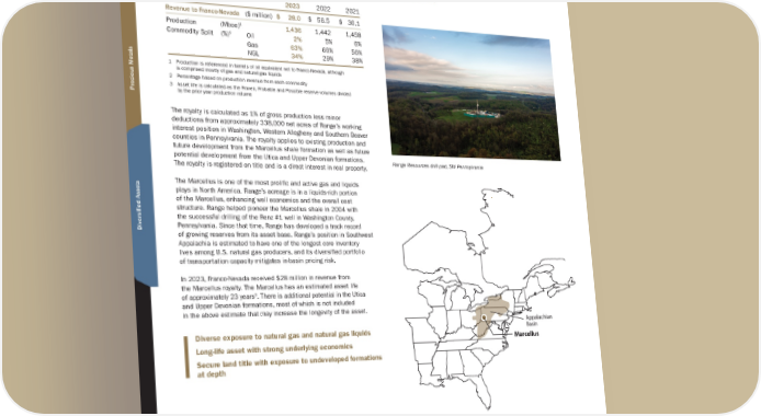 M A R C E L L U S Location: SW Pennsylvania, United States | Operator: Range Resources | Energy: Natural Gas and NGLs | Royalty: 1% overriding royalty Franco-Nevada has a 1% royalty on the majority of Range Resources Corporation’s (“Range”) operated position in Southwest Pennsylvania. 2023 2022 2021 Revenue to Franco-Nevada ($ million) $ 28.0 $ 56.5 $ 36.1 Production (Mboe) 1 1,436 1,442 1,458 Commodity Split (%) 2 Oil 2% 5% 6% Gas 63% 66% 56% NGL 34% 29% 38% 1 Production is referenced in barrels of oil equivalent net to Franco-Nevada, although is comprised mostly of gas and natural gas liquids 2 Percentage based on production revenue from each commodity 3 Asset life is calculated as the Proven, Probable and Possible reserve volumes divided by the prior year production volume The royalty is calculated as 1% of gross production less minor deductions from approximately 338,000 net acres of Range’s working interest position in Washington, Western Allegheny and Southern Beaver counties in Pennsylvania. The royalty applies to existing production and future development from the Marcellus shale formation as well as future potential development from the Utica and Upper Devonian formations. The royalty is registered on title and is a direct interest in real property. The Marcellus is one of the most prolific and active gas and liquids plays in North America. Range’s acreage is in a liquids-rich portion of the Marcellus, enhancing well economics and the overall cost structure. Range helped pioneer the Marcellus shale in 2004 with the successful drilling of the Renz #1 well in Washington County, Pennsylvania. Since that time, Range has developed a track record of growing reserves from its asset base. Range’s position in Southwest Appalachia is estimated to have one of the longest core inventory lives among U.S. natural gas producers, and its diversified portfolio of transportation capacity mitigates in-basin pricing risk. In 2023, Franco-Nevada received $28 million in revenue from the Marcellus royalty. The Marcellus has an estimated asset life of approximately 23 years 3 . There is additional potential in the Utica and Upper Devonian formations, most of which is not included in the above estimate that may increase the longevity of the asset. Diverse exposure to natural gas and natural gas liquids Long-life asset with strong underlying economics Secure land title with exposure to undeveloped formations at depth Range Resources drill pad, SW Pennsylvania Appalachian Basin Marcellus TSX / NYSE: FNV 108 ★ Franco-Nevada Corporation North America