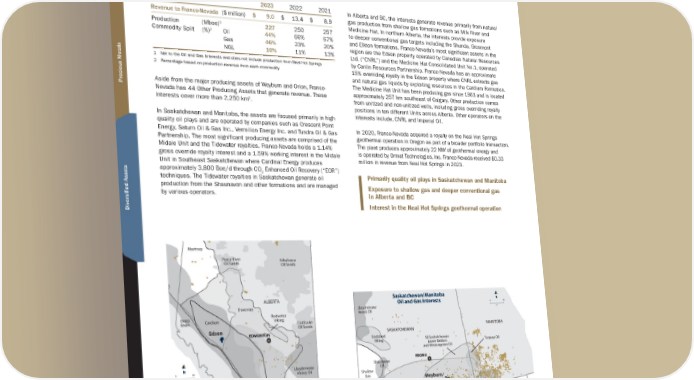 O T H E R P R O D U C I N G E N E R G Y A S S E T S Location: BC / AB / SK / MB, Canada and Oregon, U.S. | Operator: Various | Royalty: ORR/FH: 0.5-20% Franco-Nevada has other interests in Western Canada which generate revenue primarily through lessor royalties and GORRs. 2023 2022 2021 Revenue to Franco-Nevada ($ million) $ 9.0 $ 13.4 $ 8.9 Production (Mboe) 1 227 250 257 Commodity Split (%) 2 Oil 44% 66% 67% Gas 46% 23% 20% NGL 10% 11% 13% 1 Net to the Oil and Gas Interests and does not include production from Neal Hot Springs 2 Percentage based on production revenue from each commodity Aside from the major producing assets of Weyburn and Orion, Franco- Nevada has 44 Other Producing Assets that generate revenue. These interests cover more than 2,250 km 2 . In Saskatchewan and Manitoba, the assets are focused primarily in high quality oil plays and are operated by companies such as Crescent Point Energy, Saturn Oil & Gas Inc., Vermilion Energy Inc. and Tundra Oil & Gas Partnership. The most significant producing assets are comprised of the Midale Unit and the Tidewater royalties. Franco-Nevada holds a 1.14% gross override royalty interest and a 1.59% working interest in the Midale Unit in Southeast Saskatchewan where Cardinal Energy produces approximately 3,800 Boe/d through CO 2 Enhanced Oil Recovery (“EOR”) techniques. The Tidewater royalties in Saskatchewan generate oil production from the Shaunavon and other formations and are managed by various operators. In Alberta and BC, the interests generate revenue primarily from natural gas production from shallow gas formations such as Milk River and Medicine Hat. In northern Alberta, the interests provide exposure to deeper conventional gas targets including the Shunda, Grosmont and Elkton formations. Franco-Nevada’s most significant assets in the region are the Edson property operated by Canadian Natural Resources Ltd. (“CNRL”) and the Medicine Hat Consolidated Unit No.1, operated by Canlin Resources Partnership. Franco-Nevada has an approximate 15% overriding royalty in the Edson property where CNRL extracts gas and natural gas liquids by exploiting resources in the Cardium Formation. The Medicine Hat Unit has been producing gas since 1963 and is located approximately 257 km southeast of Calgary. Other production comes from unitized and non-unitized wells, including gross overriding royalty positions in ten different Units across Alberta. Other operators on the interests include, CNRL and Imperial Oil. In 2020, Franco-Nevada acquired a royalty on the Neal Hot Springs geothermal operation in Oregon as part of a broader portfolio transaction. The plant produces approximately 22 MW of geothermal energy and is operated by Ormat Technologies, Inc. Franco-Nevada received $0.33 million in revenue from Neal Hot Springs in 2023. Primarily quality oil plays in Saskatchewan and Manitoba Exposure to shallow gas and deeper conventional gas in Alberta and BC Interest in the Neal Hot Springs geothermal operation N km 0 80 BRITISH COLUMBIA MONTANA IDAHO WASHINGTON Montney Deep Basin Edson Cardium Duvernay Alberta Bakken Lloydminster Heavy Oil Shallow Gas CBM (HSCN) Redwater Viking CALGARY Peace River Oil Sands Athabasca Oil Sands Cold Lake Oil Sands Alberta/ British Columbia Oil and Gas Interests ALBERTA EDMONTON SASKATCHEWAN Company Core Land Company Non Core Land Major City MANITOBA SASKATCHEWAN NORTH DAKOTA MONTANA Sanish Oil Torquay Oil SE Saskatchewan Lower Bakken and Mississippian Oil Williston Basin Bakken Dodsland Viking Shallow Gas Spearfish Oil REGINA Lloydminster Heavy Oil Shaunavon Oil N km 0 80 Saskatchewan/Manitoba Oil and Gas Interests Weyburn/ Midale ALBERTA Company Core Land Company Non Core Land Major City TSX / NYSE: FNV 114 ★ Franco-Nevada Corporation North America