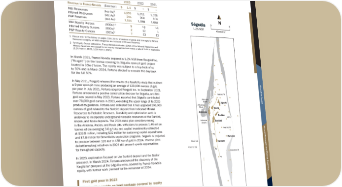 S É G U É L A Location: Côte d’Ivoire | Operator: Fortuna Silver Mines Inc. | Precious Metals: Au | Royalty: NSR: 1.2% Franco-Nevada holds a 0.6% NSR on the Séguéla gold mine, owned and operated by Fortuna Silver Mines Inc. (“Fortuna”). 2023 2022 2021 Revenue to Franco-Nevada ($ million) $ 1.4 $ − $ − M&I Resources (koz Au) 1 1,535 1,611 1,328 Inferred Resources (koz Au) 1 245 960 104 P&P Reserves (koz Au) 1 1,154 1,088 1,088 M&I Royalty Ounces (000s) 1,2 9 19 16 Inferred Royalty Ounces (000s) 2 2 12 1 P&P Royalty Ounces (000s) 2 7 13 13 1 Please refer to the tables on pages 118-124 for a breakout of grade and tonnages by Mineral Resource category; all M&I categories are inclusive of Mineral Reserves 2 For Royalty Ounce calculation, Franco-Nevada estimates 100% of the Mineral Resources and Mineral Reserves are subject to our royalty interest and estimates a rate of 0.6% is applicable (1.2% NSR in 2022, 1.2% NSR in 2021) In March 2021, Franco-Nevada acquired a 1.2% NSR from Roxgold Inc. (“Roxgold”) on the license covering its Séguéla open-pit gold project located in Côte d’Ivoire. The royalty was subject to a buy-back of up to 50% and in March 2024, Fortuna elected to execute this buy-back for the full 50%. In May 2021, Roxgold released the results of a feasibility study that outlined a 9-year open-pit mine producing an average of 120,000 ounces of gold per year. In July 2021, Fortuna acquired Roxgold Inc. In September 2021, Fortuna announced a positive construction decision for Séguéla, and first gold was poured in May 2023. Fortuna reported that Séguéla contributed over 78,600 gold ounces in 2023, exceeding the upper range of its 2023 production guidance. Fortuna also indicated that it had upgraded 206,000 ounces of gold related to the Sunbird deposit from Indicated Mineral Resources to Probable Reserves. Feasibility and optimization work is underway to incorporate underground mineable resources at the Sunbird, Ancien, and Koula deposits. The 2024 mine plan considers mining in the Antenna, Ancien, and Koula pits, with plans to process 1.46 million tonnes of ore averaging 3.0 g/t Au, and capital investments estimated at $39.8 million, including $32 million for sustaining capital expenditures and $7.8 million for Brownfields exploration programs. Seguela is projected to produce between 126 koz to 138 koz of gold in 2024. Process plant de-bottlenecking initiatives in 2024 still present upside opportunities for throughput capacity. In 2023, exploration focused on the Sunbird deposit and the Badior prospect. In March 2024, Fortuna announced the discovery of the Kingfisher prospect at the Séguéla mine, covered by Franco-Nevada’s royalty, with further work planned for the remainder of 2024. Séguéla 1.2% NSR kilometer 5 0 N Vincho UG Raul UG Ancien Agouti Boulder Winy Gabbro W Antenna South Antenna North Antenna West P1 Kwenko Siakasso N P7 P2 Kwenko W Koula Antenna Sunbird Schist Resource Pit Target Target Strat Séguéla NSR Area Pelite First gold pour in 2023 Exploration upside on land package covered by royalty Franco-Nevada Corporation ★ 73 TSX / NYSE: FNV Rest of World