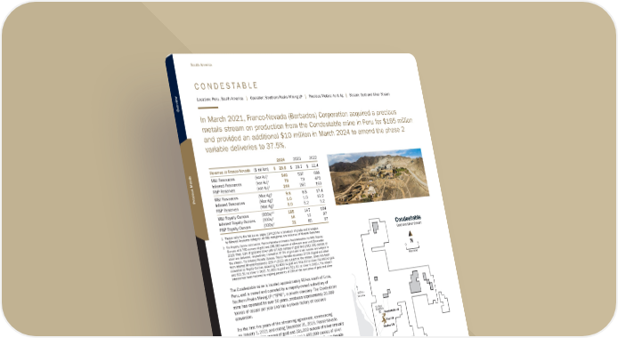 C O N D E S T A B L E Location: Peru, South America | Operator: Southern Peaks Mining LP | Precious Metals: Au & Ag | Stream: Gold and Silver Stream In March 2021, Franco-Nevada (Barbados) Corporation acquired a precious metals stream on production from the Condestable mine in Peru for $165 million and provided an additional $10 million in March 2024 to amend the phase 2 variable deliveries to 37.5%. 2024 2023 2022 Revenue to Franco-Nevada ($ million) $ 29.9 $ 23.7 $ 22.4 M&I Resources (koz Au)1 546 537 688 Inferred Resources (koz Au)1 78 79 479 P&P Reserves (koz Au)1 244 267 163 M&I Resources (Moz Ag)1 9.8 9.8 17.4 Inferred Resources (Moz Ag)1 1.0 1.0 12.2 P&P Reserves (Moz Ag)1 5.0 5.2 5.2 M&I Royalty Ounces (000s)1,2 185 147 164 Inferred Royalty Ounces (000s)2 18 12 87 P&P Royalty Ounces (000s)2 72 85 97 1 Please refer to the tables on pages 114-120 for a breakout of grade and tonnages by Mineral Resource category; all M&I categories are inclusive of Mineral Reserves 2 For Royalty Ounce calculation, Franco-Nevada estimates fixed deliveries for M&I Royalty Ounces of 8,760 ounces of gold and 291,000 ounces of silver per year until December 2025; then, 63% of gold and silver until 87,600 ounces of gold and 2,910,000 ounces of silver are delivered, respectively; thereafter, 37.5% of gold and silver ounces are subject to the stream. For Inferred Royalty Ounces, Franco-Nevada assumes 37.5% of gold and silver from Inferred Mineral Resources (25% in 2023) are subject to the stream. Silver has been converted to Royalty Ounces assuming $2,800/oz gold and $31.00/oz silver ($1,950/oz gold and $22.50/oz silver in 2023, $1,800/oz gold and $21.00/oz silver in 2022). The stream interest has been factored by ongoing payments of 20% of the spot price of gold and silver The Condestable mine is located approximately 90 km south of Lima, Peru, and is owned and operated by a majority-owned subsidiary of Southern Peaks Mining LP (“SPM”), a private company. The Condestable mine has operated for over 50 years, produces approximately 20,000 tonnes of copper per year and has a proven history of resource conversion. For the first five years of the streaming agreement, commencing on January 1, 2021 and ending December 31, 2025, Franco-Nevada will receive 8,760 ounces of gold and 291,000 ounces of silver annually until a total of 43,800 ounces of gold and 1,455,000 ounces of silver have been delivered (the “Fixed Deliveries”). Thereafter, Franco-Nevada will receive 63% of the gold and silver contained in concentrate until a cumulative total of 87,600 ounces of gold and 2,910,000 ounces of silver have been delivered (the “Variable Phase 1 Deliveries”). The stream then reduces to 37.5% over the remaining life of mine (the “Variable Phase 2 Deliveries”). The Variable Phase 2 Deliveries were increased from 25% to 37.5%, as part of the March 2024 amendment. Franco-Nevada will pay 20% of the spot price for gold and silver for each ounce delivered under the stream (the “Ongoing Payment”). The stream is referenced to Condestable concessions covering approximately 450 km2 with excellent near mine exploration upside. Throughput at the mine averaged 7,600 tonnes per day in 2024. SPM is ramping up to the 8,400 tonnes per day, which was achieved for a sustained period at the end of the year, and is currently constructing a tailings filtration plant which extends the life of the tailings storage facilities. Condestable, Peru Condestable UG Surface facilities Raul UG Vinchos UG Pacifc Ocean Pan American Hwy 102 km to Lima Condestable Gold and Silver Stream kilometer 5 0 kilometer 5 0 Condestable Mining Property Excluded from Stream N Pacifc Ocean Argentina Bolivia Peru Brazil Chile Condestable Proven operation with excellent potential for expansions and mine life extension Increased LOM exposure with additional $10M deposit Large, prospective land package of approximately 450 km² TSX / NYSE: FNV 28 ★ Franco-Nevada Corporation South America Overview Precious Metals