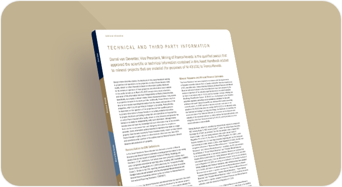 T E C H N I C A L A N D T H I R D - P A R T Y I N F O R M A T I O N Except where otherwise stated, the disclosure in this Asset Handbook relating to properties and operations on the properties on which Franco-Nevada holds royalty, stream or other interests is based on information publicly disclosed by the owners or operators of these properties and information/data available in the public domain as at March 13, 2025 (except where stated otherwise), and none of this information has been independently verified by Franco-Nevada. Specifically, as a royalty or stream holder, Franco-Nevada has limited, if any, access to properties included in its asset portfolio. Additionally, Franco-Nevada may from time to time receive operating information from the owners and operators of the properties, which it is not permitted to disclose to the public. Franco-Nevada is dependent on the operators of the properties and their qualified persons to provide information to Franco-Nevada or on publicly available information to prepare disclosure pertaining to properties and operations on the properties on which Franco-Nevada holds royalty, stream or other interests and generally has limited or no ability to independently verify such information. Although Franco- Nevada does not have any knowledge that such information may not be accurate, there can be no assurance that such third-party information is complete or accurate. Some information publicly reported by operators may relate to a larger property than the area covered by Franco-Nevada’s royalty, stream or other interest. Franco-Nevada’s royalty, stream or other interests often cover less than 100% and sometimes only a portion of the publicly reported Mineral Resource, Mineral Reserve and production of a property. Reconciliation to CIM Definitions In this Asset Handbook, Franco-Nevada has disclosed a number of Mineral Resource and Mineral Reserve estimates covering properties related to the mining assets that are not based on Canadian Institute of Mining, Metallurgy and Petroleum (“CIM”) definitions, but instead have been prepared in reliance upon other comparable international reporting codes, including JORC (Australia), SAMREC (South Africa) and Regulation S-K 1300 (collectively, the “Acceptable Foreign Codes”). Similar to the CIM, reporting standards adopted by these Acceptable Foreign Codes are all compliant with the international Mineral Resource and Mineral Reserve Guidelines defined by the Committee for Mineral Reserves International Reporting Standards (“CRIRSCO”). In each case, the Mineral Resources and Mineral Reserves reported in this Asset Handbook are based on estimates previously disclosed by the relevant property owner or operator, without reference to the underlying data used to calculate the estimates. Accordingly, Franco-Nevada is unable to reconcile the Mineral Resource and Mineral Reserve estimates prepared in reliance with the Acceptable Foreign Codes with that of CIM definitions. Franco-Nevada sought confirmation from one of its technical advisory firms, that is comprised of engineers experienced in the preparation of Mineral Resource and Mineral Reserve estimates using CIM and each of the Acceptable Foreign Codes, of the extent to which an estimate prepared under an Acceptable Foreign Code would differ from that prepared under CIM definitions. Franco-Nevada was advised that CIM are largely comparable to those of the Acceptable Foreign Codes, the Mineral Resource and Mineral Reserve definitions and categories are substantively the same as the CIM definitions mandated in NI 43-101 and will typically result in reporting of substantially similar Mineral Resource and Mineral Reserve estimates. Such advisors further confirmed, without reference to the procedures in which the estimates prepared using Acceptable Foreign Codes that are reproduced in this Asset Handbook were conducted, that in the course of their preparation of a Mineral Resource or Mineral Reserve estimate they would effectively use the same procedures to prepare and report the Mineral Resource or Mineral Reserve estimate regardless of the reliance on CIM or any of the Acceptable Foreign Codes. Mineral Resource and Mineral Reserve Estimates This Asset Handbook has been prepared in accordance with the requirements of Canadian securities laws in effect in Canada, which differ from the requirements of U.S. securities laws. Unless otherwise indicated, all Mineral Resource and Mineral Reserve estimates included in this Asset Handbook have been prepared by the owners or operators of the relevant properties (as and to the extent indicated by them) in accordance with NI 43-101 and the Canadian Institute of Mining and Metallurgy Classification System. NI 43-101 is a rule developed by the Canadian securities regulatory authorities which establishes standards for all public disclosure an issuer makes of scientific and technical information concerning mineral projects. NI 43-101 permits a historical estimate made prior to the adoption of NI 43-101 that does not comply with NI 43-101 to be disclosed using the historical terminology if, among other things, the disclosure: (a) identifies the source and date of the historical estimate; (b) comments on the relevance and reliability of the historical estimate; (c) states whether the historical estimate uses categories other than those prescribed by NI 43-101; and (d) includes any more recent estimates or data available. Mining disclosure under U.S. securities law was previously required to comply with SEC Industry Guide 7 (“SEC Industry Guide 7”) under the United States Securities Exchange Act of 1934, as amended. The SEC has adopted rules to replace SEC Industry Guide 7 with new mining disclosure rules under sub-part 1300 of Regulation S-K of the U.S. Securities Act of 1933 (“Regulation S-K 1300”), which became mandatory for U.S. reporting companies beginning with the first fiscal year commencing on or after January 1, 20