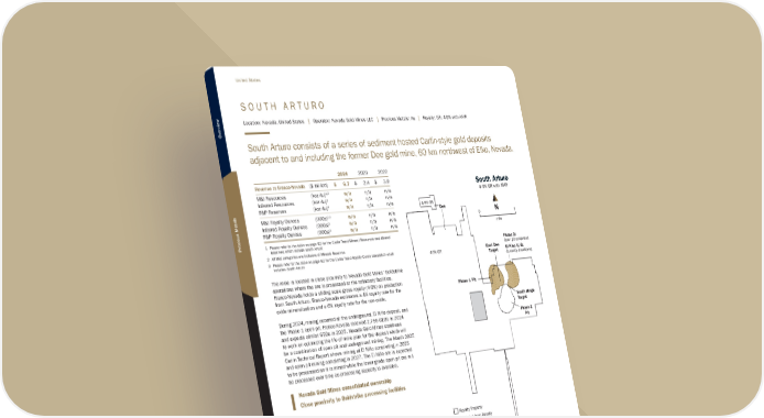 S O U T H A R T U R O Location: Nevada, United States | Operator: Nevada Gold Mines LLC | Precious Metals: Au | Royalty: GR: 4-9% with AMR South Arturo consists of a series of sediment hosted Carlin-style gold deposits adjacent to and including the former Dee gold mine, 60 km northwest of Elko, Nevada. 2024 2023 2022 Revenue to Franco-Nevada ($ million) $ 6.7 $ 2.4 $ 3.9 M&I Resources (koz Au)1,2 n/a n/a n/a Inferred Resources (koz Au)1 n/a n/a n/a P&P Reserves (koz Au)1 n/a n/a n/a M&I Royalty Ounces (000s)2,3 n/a n/a n/a Inferred Royalty Ounces (000s)3 n/a n/a n/a P&P Royalty Ounces (000s)3 n/a n/a n/a 1 Please refer to the table on page 62 for the Carlin Trend Mineral Resources and Mineral Reserves which include South Arturo 2 All M&I categories are inclusive of Mineral Reserves 3 Please refer to the table on page 62 for the Carlin Trend Royalty Ounce calculation which includes South Arturo The mine is located in close proximity to Nevada Gold Mines’ Goldstrike operations where the ore is processed at the refractory facilities. Franco-Nevada holds a sliding scale gross royalty (4-9%) on production from South Arturo. Franco-Nevada estimates a 4% royalty rate for the oxide mineralization and a 6% royalty rate for the non-oxide. During 2024, mining occurred at the underground, El Niño deposit, and the Phase 1 open pit. Franco-Nevada received 2,756 GEOs in 2024 and expects similar GEOs in 2025. Nevada Gold Mines continues to work on optimizing the life of mine plan for the deposit which will be a combination of open pit and underground mining. The March 2025 Carlin Technical Report shows mining at El Niño completing in 2026 and open pit mining completing in 2027. The El Niño ore is expected to be processed as it is mined while the lower grade open pit ore will be processed over time as processing capacity is available. South Arturo Pacifc Ocean Oregon Idaho Utah Nevada California Arizona Mexico South Arturo 4-9% GR with AMR Royalty Property Pits Excluded from Royalty Exploration Targets Dee Phase 1 Pit Phase 3 Pit Phase 2: Open pit completed El Nino U/G: Currently developing East Dee Target South Hinge Target 4-9% GR 4-9% GR mile 1 0 N Nevada Gold Mines consolidated ownership Close proximity to Goldstrike processing facilities TSX / NYSE: FNV 66 ★ Franco-Nevada Corporation United States Overview Precious Metals
