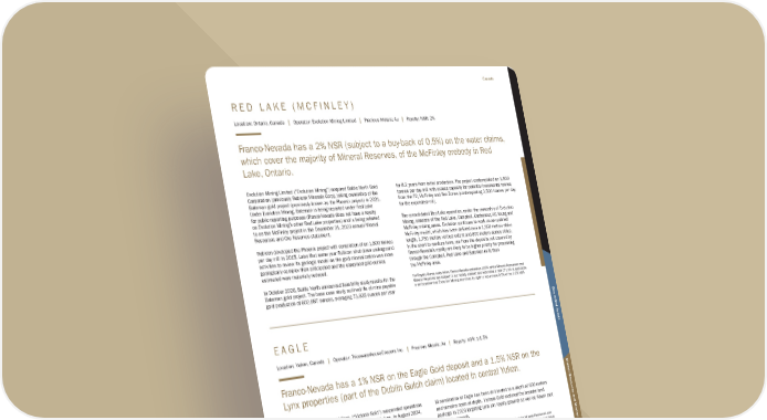 R E D L A K E ( M C F I N L E Y ) Location: Ontario, Canada | Operator: Evolution Mining Limited | Precious Metals: Au | Royalty: NSR: 2% Franco-Nevada has a 2% NSR (subject to a buy-back of 0.5%) on the water claims, which cover the majority of Mineral Reserves, of the McFinley orebody in Red Lake, Ontario. Evolution Mining Limited (“Evolution Mining”) acquired Battle North Gold Corporation (previously Rubicon Minerals Corp), taking ownership of the Bateman gold project (previously known as the Phoenix project) in 2021. Under Evolution Mining, Bateman is being reported under Red Lake for public reporting purposes (Franco-Nevada does not have a royalty on Evolution Mining’s other Red Lake properties) and is being referred to as the McFinley project in the December 31, 2023 annual Mineral Resources and Ore Reserves statement. Rubicon developed the Phoenix project with completion of an 1,800 tonnes per day mill in 2015. Later that same year Rubicon shut down underground activities to review its geologic model as the gold mineralization was more geologically complex than anticipated and the contained gold ounces estimated were materially reduced. In October 2020, Battle North announced feasibility study results for the Bateman gold project. The base case study outlined life of mine payable gold production of 602,987 ounces, averaging 73,835 ounces per year for 8.2 years from initial production. The project contemplated an 1,800 tonnes per day mill with excess capacity for potential incremental tonnes from the F2, McFinley and Pen Zones (contemplating 2,500 tonnes per day for the expanded mill). The consolidated Red Lake operation, under the ownership of Evolution Mining, consists of the Red Lake, Campbell, Cochenour, HG Young and McFinley mining areas. Evolution continues to work on an updated McFinley model, which has been defined over a 1,350 meters strike length, 1,750 meters vertical extent and 800 meters across strike. In the short to medium term, ore from the deposits not covered by Franco-Nevada’s royalty are likely to be higher priority for processing through the Campbell, Red Lake and Bateman mills than the McFinley area. For Royalty Ounce calculation, Franco-Nevada estimates 100% of the Mineral Resources and Mineral Reserves are subject to our royalty interest and estimates a rate of 1.5% is applicable in anticipation that Evolution Mining exercises its right to repurchase 0.5% of the 2.0% NSR E A G L E Location: Yukon, Canada | Operator: PricewaterhouseCoopers Inc. | Precious Metals: Au | Royalty: NSR: 1-1.5% Franco-Nevada has a 1% NSR on the Eagle Gold deposit and a 1.5% NSR on the Lynx properties (part of the Dublin Gulch claim) located in central Yukon. In June 2024, Victoria Gold Corp. (“Victoria Gold”) suspended operations at the Eagle Gold mine due to a heap leach pad failure. In August 2024, PricewaterhouseCoopers Inc. (“PwC”) was appointed as the receiver of all the assets, undertakings and property of Victoria Gold, which included the Eagle Gold mine. Prior to the receivership, Victoria Gold produced 29,580 ounces of gold in Q1 2024. Franco-Nevada’s royalty is estimated to cover the entire Eagle deposit and a small portion of the satellite Olive deposit. The 1.5% NSR on the Lynx properties is subject to a C$15,000 annual advance royalty payment and is capped at C$1,500,000. Mineralization at Eagle has been drill tested to a depth of 850 meters and remains open at depth. Victoria Gold explored the broader land package in 2023 targeting Lynx (on royalty ground) as well as Raven (not on royalty ground). For Royalty Ounce calculation, Franco-Nevada estimates 100% of the Mineral Resources and Mineral Reserves are subject to our royalty interest and estimates a rate of 1.0% is applicable Franco-Nevada Corporation ★ 57 TSX / NYSE: FNV Canada Additional Information Mineral Resources and Mineral Reserves Diversified Assets