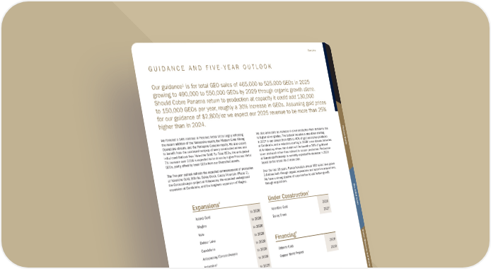 >50% of 5-year Growth is Already Under Construction 1 2025 Guidance and 2029 Outlook as published on March 10, 2025 in Franco-Nevada's 2024 Annual Report. Assuming: $2,800/oz Au, $31.00/oz Ag, $950/oz Pt, $950/oz Pd, $100/tonne Fe 62% CFR China, $70/bbl WTI oil and $3.00/mcf Henry Hub natural gas 2 Expansion periods are based on operators’ indicated period of ramp-up 3 Indicated start periods are based on operators’ guidance and FNV best estimates 4 Production growth is largely from accessing higher silver grade 5 Expansion is a combination of underlying production growth at the operation and mining on higher royalty rate ground Expansions 2 Island Gold to 2026 Magino to 2026 Vale to 2026 Detour Lake to 2028 Candelaria to 2028 Antapaccay/Coroccohuayco to 2028 Antamina4 to 2028 Marigold5 to 2029 Under Construction 3 Valentine Gold 2025 Eskay Creek 2027 Recent Mine Starts Posse (Mara Rosa) 2024 Salares Norte 2024 Greenstone 2024 Tocantinzinho 2024 Permitting 3 Castle Mountain (Phase 2) 2028 San Jorge 2029 Financing 3 Stibnite Gold 2028 Copper World Project 2029 G U I D A N C E A N D F I V E - Y E A R O U T L O O K Our guidance¹ is for total GEO sales of 465,000 to 525,000 GEOs in 2025 growing to 490,000 to 550,000 GEOs by 2029 through organic growth alone. Should Cobre Panama return to production at capacity it could add 130,000 to 150,000 GEOs per year, roughly a 30% increase in GEOs. Assuming gold prices for our guidance of $2,800/oz we expect our 2025 revenue to be more than 25% higher than in 2024. We forecast a 14% increase in Precious Metal GEOs largely reflecting the recent addition of the Yanacocha royalty, the Western Limb Mining Operations stream, and the Porcupine Complex royalty. We also expect to benefit from the continued ramp-up of newly constructed mines and initial contributions from Valentine Gold. For Total GEOs, the anticipated 7% increase over 2024 is expected to be driven by higher Precious Metal GEOs, partly offset by lower GEOs from our Diversified assets. The five-year outlook reflects the expected commencement of production at Valentine Gold, Stibnite, Eskay Creek, Castle Mountain (Phase 2), the Coroccohuayco project at Antapaccay, the expected underground expansion at Candelaria, and the long-term expansion of Magino. We also anticipate an increase in silver production from Antamina due to higher silver grades. The outlook includes a step-down starting in 2027 in our stream from 68% to 40% of gold and silver produced at Candelaria, and a reduction starting in 2028 in our stream deliveries at Antapaccay, where our stream will be based on 30% of gold and silver produced rather than indexed to copper production. Production at Guadalupe-Palmarejo is currently expected to decrease in 2029 based on the latest life of mine plan. Over the last 18 years, Franco-Nevada’s annual GEO sales have grown 2.8 times both through organic expansions and accretive acquisitions. We have a strong pipeline of opportunities to add further growth through acquisitions. Franco-Nevada Corporation ★ 15 TSX / NYSE: FNV Overview Additional Information Mineral Resources and Mineral Reserves Diversified Assets Precious Metals