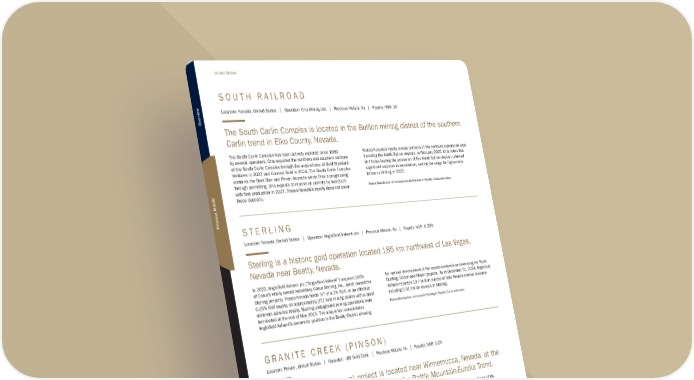 S O U T H R A I L R O A D Location: Nevada, United States | Operator: Orla Mining Ltd. | Precious Metals: Au | Royalty: NSR: 1% The South Carlin Complex is located in the Bullion mining district of the southern Carlin trend in Elko County, Nevada. The South Carlin Complex has been actively explored since 1969 by several operators. Orla acquired the northern and southern portions of the South Carlin Complex through the acquisitions of Gold Standard Ventures in 2022 and Contact Gold in 2024. The South Carlin Complex contains the Dark Star and Pinion deposits which Orla is progressing through permitting. Orla expects to receive all permits by mid-2026 with first production in 2027. Franco-Nevada’s royalty does not cover these deposits. Franco-Nevada’s royalty covers portions of the northern exploration area including the North Bullion deposit. In February 2025, Orla noted that drill holes testing the extension of the North Bullion deposit returned significant sulphide mineralization, setting the stage for high-priority follow up drilling in 2025. Franco-Nevada has not included South Railroad in Royalty Ounce estimates S T E R L I N G Location: Nevada, United States | Operator: AngloGold Ashanti plc | Precious Metals: Au | Royalty: NSR: 0.25% Sterling is a historic gold operation located 185 km northwest of Las Vegas, Nevada near Beatty, Nevada. In 2022, AngloGold Ashanti plc (“AngloGold Ashanti”) acquired 100% of Coeur’s wholly owned subsidiary, Coeur Sterling, Inc., which owned the Sterling property. Franco-Nevada holds 1/8th of a 2% NSR, or an effective 0.25% NSR royalty, on approximately 272 lode mining claims with a small minimum advance royalty. Sterling underground mining operations were terminated at the end of May 2015. The acquisition consolidates AngloGold Ashanti’s ownership position in the Beatty District allowing for optimal development of the assets centered on developing the North Bullfrog, Silicon and Merlin projects. As of December 31, 2024, AngloGold Ashanti reported 19.7 million ounces of total Nevada mineral resource including 0.91 million ounces at Sterling. Franco-Nevada has not included Sterling in Royalty Ounce estimates G R A N I T E C R E E K ( P I N S O N ) Location: Pinson, United States | Operator: i-80 Gold Corp. | Precious Metals: Au | Royalty: NSR: 1-2% The Granite Creek (Pinson) project is located near Winnemucca, Nevada, at the intersection of the Getchell Gold Belt and the Battle Mountain-Eureka Trend. Franco-Nevada holds a 1-2% NSR on approximately 20 sections within the Getchell trend. This royalty includes a 2% NSR on Section 33 and a 1% NSR on the southern half of Section 32 within Granite Creek’s operating area, formally known as Pinson. Granite Creek (Pinson) is south of Nevada Gold Mines’ Turquoise Ridge mine and 13 km from its Twin Creeks mine complex. The historic Pinson mine produced 985,000 ounces of gold from 1980 through 1999 by open-pit mining. In August 2020, Premier Gold Mines USA, Inc. acquired the outstanding interests of Osgood Mining Company LLC (“Osgood”) from affiliates of Waterton Global Resource. In 2021, Equinox Gold acquired Premier. Concurrently, Premier spun out its US-focused gold production and development assets into i-80 Gold, which included the Granite Creek project. Franco-Nevada’s royalty at Granite Creek does not cover the current underground workings but does cover portions of the development-stage open pit heap leach project. In March 2025, i-80 Gold released the results of an updated PEA on the open pit project. The PEA highlights a mine life of approximately 10 years with annual gold production averaging 130,000 ounces per year following ramp up. The current gold mineral resource is 1.44 million ounces with the majority of those ounces located within the CX and Mag pits which are partially covered by Franco-Nevada’s royalty. i-80 Gold is planning to release a further updated PEA in Q4 2025 and will continue to advance permitting and technical work on the project. Franco-Nevada has not included Granite Creek in Royalty Ounce estimates TSX / NYSE: FNV 70 ★ Franco-Nevada Corporation United States Overview Precious Metals