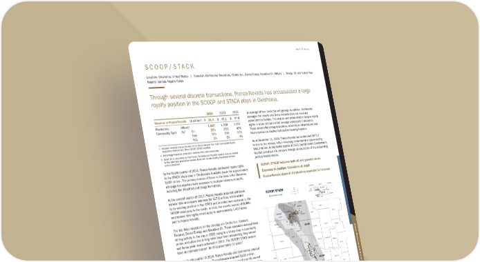 S C O O P / S T A C K Location: Oklahoma, United States | Operator: Continental Resources, Ovintiv Inc., Devon Energy, Marathon Oil, Others | Energy: Oil and Natural Gas Royalty: Various Royalty Rates Through several discrete transactions, Franco-Nevada has accumulated a large royalty position in the SCOOP and STACK plays in Oklahoma. 2024 2023 2022 Revenue to Franco-Nevada ($ million)1 $ 31.4 $ 33.1 $ 57.8 Production (Mboe)1 1,027 1,028 1,051 Commodity Split (%)2 Oil 25% 25% 40% Gas 70% 70% 57% NGL 5% 5% 4% 1 Includes revenue and production net to Franco-Nevada from both Continental Royalty Acquisition Venture and Other SCOOP/STACK royalties 2 Percentage based on production revenue from each commodity 3 Asset life is calculated as the Proven, Probable and Possible reserve volumes divided by the prior year production volume. Does not include Royalty Acquisition Venture with Continental In the fourth quarter of 2016, Franco-Nevada purchased royalty rights in the STACK shale play in Oklahoma’s Anadarko basin for approximately $100 million. The primary horizon of focus in the area is the Meramec, although the royalties have exposure to multiple horizons at depth, including the Woodford and Osage formations. In the second quarter of 2017, Franco-Nevada acquired additional mineral title and royalty interests for $27.6 million, which added to its existing position in the STACK and provided new exposure to the SCOOP shale play to the south. In total, the assets consist of GORRs and mineral title rights which apply to approximately 1,430 acres (net to Franco-Nevada). The top three operators on the acreage are Ovintiv Inc. (formerly Encana), Devon Energy, and Marathon Oil. These operators reduced their drilling activity in the play in 2020 owing to a sharp drop in commodity prices, and while the drilling rates have been rebounding, they remain well below peak levels achieved in 2019. The SCOOP/STACK assets have an estimated asset life of approximately 52 years3. In the fourth quarter of 2018, Franco-Nevada and Continental entered into a transaction whereby Franco-Nevada acquired $120 million in existing royalties owned by Continental and formed a jointly owned entity (the “Royalty Acquisition Venture”) to acquire up to $400 million in royalty rights under Continental’s area of operations. With the Royalty Acquisition Venture, Franco-Nevada funds 80% of the acreage cost and receives 50-75% of distributions, depending on performance against pre-set volume targets. Franco-Nevada received ~63% of distributions in 2024, and expect our share of distributions to increase going forward, toward a maximum of 75%. In exchange for the partial capital carry in favour of Continental, the venture provides Franco-Nevada with an opportunity to acquire royalty rights at the grass-roots level, leverage the value of Continental’s drilling plans, and benefit from the company’s knowledge of local land title and geology. In addition, Continental manages the assets and Franco-Nevada does not incur any administrative burden. The venture was established to acquire royalty rights in areas primarily within acreage operated by Continental. These areas offer strong economics, proximity to infrastructure and future upside via stacked hydrocarbon-bearing horizons. As at December 31, 2024, Franco-Nevada had contributed $473.7 million to the venture, with a remaining commitment of approximately $46.3 million. In the fourth quarter of 2022, Harold Hamm, Continental’s founder, privatized the company through an acquisition of the outstanding publicly traded shares. GARFIELD N km 0 40 Black Oil Volatile Oil Condensate Dry Gas DEWEY BLAINE KINGFISHER MAJOR CANADIAN OKLAHOMA LINCOLN CREEK OKFUSKEE HUGHES COAL ATOKA BRYAN MARSHALL JOHNSTON PONTOTOC SEMINOLE POTTAWATOMIE CLEVELAND MCCLAIN GARVIN MURRAY CARTER LOVE JEFFERSON STEPHENS CLAY COTTON WICHITA WILBARGER TILLAMAN JACKSON KIOWA GRADY GREER WASHITA COMANCHE LOGAN PAYNE CADDO CUSTER Pressure Transition miles 0 25 SCOOP/STACK STACK FNV Royalty Acreage Oklahoma City OKLAHOMA SCOOP TEXAS KANSAS ARKANSAS NEW MEXICO MISSOURI COLORADO Anadarko Basin STACK SCOOP SCOOP/STACK includes both oil and gas-rich areas Exposure to multiple formations at depth Franco-Nevada share of distributions expected to increase Note: Map does not show acreage under Royalty Acquisition Vechicle with Continental Franco-Nevada Corporation ★ 107 TSX / NYSE: FNV North America Additional Information Mineral Resources and Mineral Reserves
