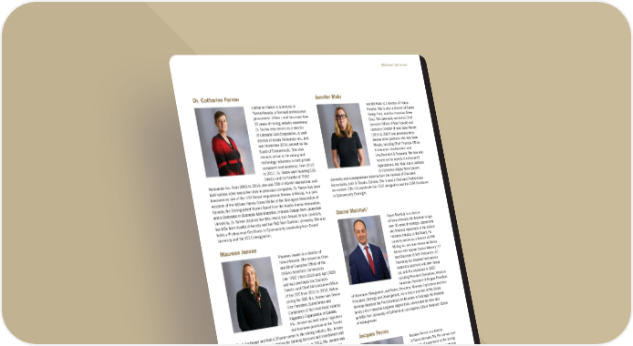 Dr. Catharine Farrow Catharine Farrow is a director of Franco-Nevada, a licensed professional geoscientist (P.Geo.) and has more than 30 years of mining industry experience. Dr. Farrow also serves as a director of Eldorado Gold Corporation, is lead director of Aclara Resources Inc., and until November 2024, served on the Board of Centamin plc. She also remains active in the mining and technology industries in both private companies and academia. From 2012 to 2017, Dr. Farrow was Founding CEO, Director and Co-Founder of TMAC Resources Inc. From 2003 to 2012, she was COO of KGHM International and held various other executive roles in precursor companies. Dr. Farrow has been honoured as one of the 100 Global Inspirational Women in Mining, is a past recipient of the William Harvey Gross Medal of the Geological Association of Canada, the Distinguished Alumni Award from the Acadia Alumni Association, and a Doctorate in Business Administration (Honoris Causa) from Laurentian University. Dr. Farrow obtained her BSc (Hons) from Mount Allison University, her MSc from Acadia University and her PhD from Carleton University. She also holds a Professional Certificate in Cybersecurity Leadership from Cornell University and the ICD.D designation. Maureen Jensen Maureen Jensen is a director of Franco-Nevada. She served as Chair and Chief Executive Officer of the Ontario Securities Commission (the “OSC”) from 2016 until April 2020 and was previously the Executive Director and Chief Administrative Officer of the OSC from 2011 to 2016. Before joining the OSC, Ms. Jensen was Senior Vice President, Surveillance and Compliance at the Investment Industry Regulatory Organization of Canada. Ms. Jensen has held senior regulatory and business positions at the Toronto Stock Exchange and had a 20-year career in the mining industry. Ms. Jensen is Chair of Canada’s Ombudsman for Banking Services and Investments and is a Public Governor of FINRA in the United States. In 2022, Ms. Jensen was inducted into the Canadian Mining Hall of Fame. Ms. Jensen is a licensed professional geoscientist (P.Geo.) with Professional Geoscientists Ontario (PGO), holds the ICD.D and GCB.D designations, has a BSc, Doctor of Laws (Honoris Causa) and is a member of the Investment Industry Hall of Fame. Jennifer Maki Jennifer Maki is a director of Franco- Nevada. She is also a director of Baytex Energy Corp. and Pan American Silver Corp. She previously served as Chief Executive Officer of Vale Canada and Executive Director of Vale Base Metals (2014 to 2017) and previously held several other positions with Vale Base Metals, including Chief Financial Officer & Executive Vice-President and Vice-President & Treasurer. She has also served on the boards of not-for-profit organizations. Ms. Maki has a Bachelor of Commerce degree from Queen’s University and a postgraduate diploma from the Institute of Chartered Accountants, both in Ontario, Canada. She is also a Chartered Professional Accountant (CPA, CA) and holds the ICD.D designation and the CERT Certificate in Cybersecurity Oversight. Daniel Malchuk1 Daniel Malchuk is a director of Franco-Nevada. Mr. Malchuk brings over 30 years of strategic, operational and financial experience in the natural resource industry to the Board. He currently serves as a director of SSR Mining Inc. and also serves as Senior Advisor with Appian Capital Advisory LLP and Chairman of Jetti Resources LLC. Previously, Mr. Malchuk held various leadership positions with BHP Group Ltd. until his retirement in 2020 including President Operations, Minerals Americas, President of Copper, President of Aluminum, Manganese, and Nickel, President, Minerals Exploration and Vice President, Strategy and Development. He is also a member of the Senior Advisory Board at the Pre-Columbian Art Museum in Santiago. Mr. Malchuk holds a Civil Industrial Engineer degree from Universidad de Chile and an MBA from University of California at Los Angeles (UCLA) Anderson School of Management. Jacques Perron Jacques Perron is a director of Franco-Nevada. Mr. Perron has over 40 years of experience in the mining industry and has extensive technical and operations experience. He currently serves as a director of Centerra Gold Inc. and as director and Chair of Arizona Metals Corp. Previously, Mr. Perron was President and Chief Executive Officer at a number of mining companies including Pretium Resources Inc., Thompson Creek Metals Company Inc. and St Andrew Goldfields Ltd. and has held senior executive roles at a number of other mining companies prior thereto. Mr. Perron is also the Chair of the Canadian Mineral Industry Education Foundation. Mr. Perron has a Bachelor of Science degree in Mining Engineering from l’École Polytechnique de Montréal. 1 Mr. Malchuk is standing for election as a first-time nominee at the Annual and Special Meeting of Shareholders to be held on May 8, 2025. He was appointed to the Board of the Corporation on January 8, 2025 Franco-Nevada Corporation ★ 125 TSX / NYSE: FNV Additional Information