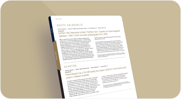 P A N D O R A Location: South Africa | Operator: Sibanye Stillwater Limited | Precious Metals: PGM | Royalty: NSR: 1% Franco-Nevada’s 1.0% Pandora NSR covers part of Sibanye-Stillwater’s Marikana operations within their Western Limb PGM Mining Operations in South Africa. In February 2025, the 5% net profit interest previously held by Franco- Nevada on the Pandora property was converted to a 1% net smelter return royalty. Sibanye-Stillwater’s Pandora property forms a portion of its Marikana operations and is 100% owned following its acquisition of Lonmin plc (“Lonmin”) in June 2019 and includes the currently operating E3 decline. The royalty ground includes extensive underground resources, which offers the potential for the development of low capital cost, brownfields, and replacement projects. Sibanye-Stillwater has identified a number of these projects in various stages of pre-feasibility and feasibility studies which have the potential to meaningfully extend the mine life and substantially increase production levels with the E3 extension, E4, and Saffy projects covering a portion of the royalty ground. For Royalty Ounce calculation, please refer to page 72 for the Western Limb Mining Operations table and notes which includes the 1% NSR on Pandora S O U T H K A L G O O R L I E Location: Australia | Operator: Northern Star Resources Limited | Precious Metals: Au | Royalty: NSR: 1-4% Northern Star Resources Limited (“Northern Star”) operates the South Kalgoorlie Operation (“SKO”) which has been producing gold since 1989. SKO is located 15 km south of Kalgoorlie in Western Australia. Franco- Nevada holds a 1.75-4% NSR royalty for gold and a 1-2.25% NSR royalty for other minerals which covers 470 km2 of the SKO tenements including the HBJ underground mine and the Mt Marion and Pernatty satellite deposits, along with the 1.2 million tonnes per annum Jubilee Mill. Northern Star placed the Jubilee mill on care and maintenance in July 2022, with ore feed directed to mills at Kanowna Belle and Fimiston. Effective January 1, 2023, the royalty agreement was amended to increase the royalty rate on the northern and central sections of the HBJ underground mine from 1.75% to 4%. Northern Star combines reporting of SKO with the Kanowna Belle gold mine, and reported total production of 173,160 ounces of gold at the combined Kalgoorlie Operations for the year ended December 31, 2024. Franco-Nevada estimates that the royalty production accounts for approximately 50% of total combined Kalgoorlie Operations production. Franco-Nevada received $10.5 million of royalty revenue from SKO in 2024. In June 2023 Northern Star approved the A$ 1.5 billion Fimiston Mill Expansion Project to increase and modernize KCGM’s processing capacity from 13 million tonnes per annum to 27 million tonnes per annum. Construction is underway and scheduled for three years, with a two-year ramp-up towards steady state of 27 million tonnes per annum by 2029. Exploration activity includes the Hercules discovery announced May 2023, located 20 km west of the HBJ mine on tenements subject to a 1.75% royalty to Franco-Nevada. Drilling results include 21 meters at 3.0 g/t gold. For Royalty Ounce calculation, Franco-Nevada estimates 32% of Mineral Resources and Mineral Reserves are subject to our royalty interest and estimates a rate of 4.0% is applicable for Mineral Resources and Mineral Reserves D U K E T O N Location: Australia | Operator: Regis Resources Ltd. | Precious Metals: Au | Royalty: NSR: 2% Franco-Nevada has a 2% NSR royalty that covers 2,678 km2 of the Duketon gold project in Western Australia. The project is operated by Regis Resources Ltd. (“Regis”) and includes six operating mines and multiple satellite deposits at various stages of development. The royalty covers all known Mineral Resources and Mineral Reserves, except for the Gloster, Ben Hur and Anchor satellite deposits and portions of the Erlistoun, Dogbolter and Petra satellite deposits. Regis reported production of 258,861 ounces of gold for 2024 and provided production guidance of 220,000 to 240,000 ounces of gold for the fiscal year ending June 30, 2025. During 2024, approximately 86% of total Duketon production was subject to Franco-Nevada’s royalty and a similar portion is expected in 2025. The three mills (Moolart Well, Garden Well and Rosemont) at Duketon have total processing capacity of 10 million tonnes per annum. Ore is sourced primarily from the Garden Well and Rosemont underground mines, and the Ben Hur open pit. Multiple low-grade stockpiles provide feed to all three mills. For Royalty Ounce calculation, Franco-Nevada estimates 89% (88% in 2023, 88% in 2022) of Mineral Reserves and 87% of the Mineral Resources (84% in 2023, 86% in 2022) are subject to our royalty interest and estimates a rate of 2.0% is applicable TSX / NYSE: FNV 80 ★ Franco-Nevada Corporation Rest of World Overview Precious Metals