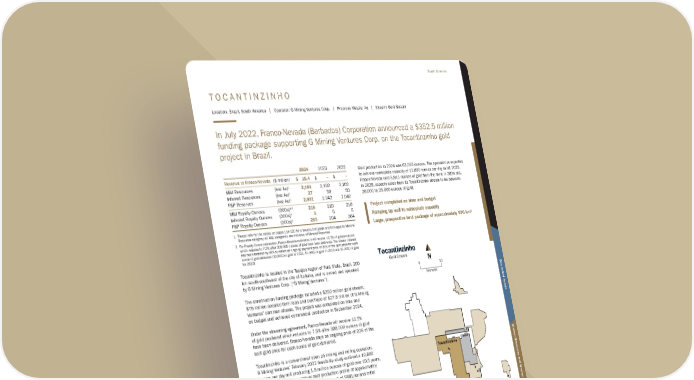 T O C A N T I N Z I N H O Location: Brazil, South America | Operator: G Mining Ventures Corp. | Precious Metals: Au | Stream: Gold Stream In July 2022, Franco-Nevada (Barbados) Corporation announced a $352.5 million funding package supporting G Mining Ventures Corp. on the Tocantinzinho gold project in Brazil. 2024 2023 2022 Revenue to Franco-Nevada ($ million) $ 15.4 $ – $ – M&I Resources (koz Au)1 2,181 2,102 2,102 Inferred Resources (koz Au)1 27 50 50 P&P Reserves (koz Au)1 2,031 2,042 2,042 M&I Royalty Ounces (000s)1,2 218 210 210 Inferred Royalty Ounces (000s)2 3 5 5 P&P Royalty Ounces (000s)2 203 204 204 1 Please refer to the tables on pages 114-120 for a breakout of grade and tonnages by Mineral Resource category; all M&I categories are inclusive of Mineral Reserves 2 For Royalty Ounce calculation, Franco-Nevada estimates it will receive 12.5% of gold produced which reduces to 7.5% after 300,000 ounces of gold have been delivered. The stream interest has been factored by 80% to reflect an ongoing payment price of 20% of the spot price for each ounce of gold delivered ($2,800/oz gold in 2024, $1,950/oz gold in 2023 and $1,800/oz gold for 2022) Tocantinzinho is located in the Tapajos region of Pará State, Brazil, 200 km south-southwest of the city of Itaituba, and is owned and operated by G Mining Ventures Corp. (“G Mining Ventures”). The construction funding package included a $250 million gold stream, $75 million secured term loan and purchase of $27.5 million of G Mining Ventures’ common shares. The project was completed on time and on budget and achieved commercial production in September 2024. Under the streaming agreement, Franco-Nevada will receive 12.5% of gold produced which reduces to 7.5% after 300,000 ounces of gold have been delivered. Franco-Nevada pays an ongoing price of 20% of the spot gold price for each ounce of gold delivered. Tocantinzinho is a conventional open pit mining and milling operation. G Mining Ventures’ February 2022 feasibility study outlined a 12,600 tonnes per day mill producing 1.8 million ounces of gold over 10.5 years, resulting in an average annual gold production profile of approximately 175,000 ounces with an all-in-sustaining cost of $681/oz and initial capital cost of $458 million. Gold production in 2024 was 63,566 ounces. The operation is expected to achieve nameplate capacity of 12,890 tonnes per day in H1 2025. Franco-Nevada sold 5,813 ounces of gold from the mine in 2024 and, in 2025, expects sales from its Tocantinzinho stream to be between 20,000 to 25,000 ounces of gold. Tocantinzinho, Brazil Tocantinzinho Gold Stream kilometer 10 0 N Tocantinzinho Pacifc Ocean Argentina Bolivia Peru Brazil Tocantinzinho Mining Licenses Exploration Licenses Excluded from Stream Licenses under application Project completed on time and budget Ramping up well to nameplate capacity Large, prospective land package of approximately 996 km² Franco-Nevada Corporation ★ 29 TSX / NYSE: FNV South America Additional Information Mineral Resources and Mineral Reserves Diversified Assets