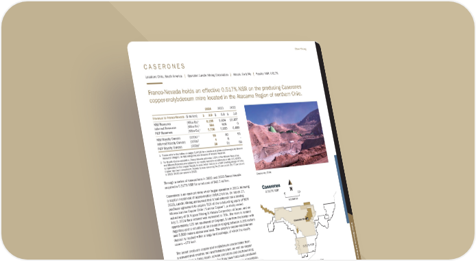 C A S E R O N E S Location: Chile, South America | Operator: Lundin Mining Corporation | Metals: Cu & Mo | Royalty: NSR: 0.517% Franco-Nevada holds an effective 0.517% NSR on the producing Caserones copper-molybdenum mine located in the Atacama Region of northern Chile. 2024 2023 2022 Revenue to Franco-Nevada ($ million) $ 3.9 $ 5.8 $ 3.0 M&I Resource (Mlbs Cu)1 8,195 9,434 10,197 Inferred Resource (Mlbs Cu)1 564 908 0 P&P Reserves (Mlbs Cu)1 5,736 5,990 6,489 M&I Royalty Ounces (000s)1,2 55 80 93 Inferred Royalty Ounces (000s)2 4 8 – P&P Royalty Ounces (000s)2 38 51 59 1 Please refer to the tables on pages 114-120 for a breakout of grade and tonnages by Mineral Resource category; all M&I categories are inclusive of Mineral Reserves 2 For Royalty Ounce calculation, Franco-Nevada estimates 100% of the Mineral Resources and Mineral Reserves are subject to our royalty interest and estimates a rate of 0.4395% is applicable for the copper Royalty Ounces (which factors in a NSR smelting charge of 15%). Copper has been converted to Royalty Ounces assuming $4.25 per pound ($3.75 per pound in 2023, $4.00 per pound in 2022) Through a series of transactions in 2022 and 2023 Franco-Nevada acquired a 0.517% NSR for a net cost of $42.3 million. Caserones is an open pit mine which began operation in 2013, following a capital investment of approximately US$4.2 billion. On March 27, 2023, Lundin Mining announced that it had entered into a binding purchase agreement to acquire 51% of the outstanding equity of SCM Minera Lumina Copper Chile (“Lumina Copper”), a wholly owned subsidiary of JX Nippon Mining & Metals Corporation of Japan, and on July 2, 2024 their interest was increased to 70%. The mine is located approximately 125 km southeast of Copiapó, 9 km from the border with Argentina and is situated at an elevation ranging between 3,200 meters and 5,500 meters above sea level. The porphyry copper-molybdenum deposit is located within a large land package, of which the royalty covers ~170 km2. The asset produces copper and molybdenum concentrates from a conventional crusher, mill and flotation plant, as well as copper cathode from a dump leach, solvent extraction and electrowinning plant (“SX-EW”). The processing facilities have historically produced approximately 100,000 to 120,000 tonnes of copper in concentrate, 1,700 to 2,500 tonnes of molybdenum in concentrate and approximately 25,000 tonnes of copper cathodes per year. Lundin issued guidance for 115,000 to 125,000 tonnes of copper in 2025 (on a 100% basis) and they plan to carry out an 18,000 meter drill program on their large land package. Caserones, Chile 1 Grants the title holder the right to perform mining operations and to extract ore 2 Grants the title holder the right to explore exclusively a determined area for a specified amount of time Caserones 0.517% NSR Chile Caserones Mine Argentina Arica Iquique Antofagasta Santiago Copiapo Relincho Argentina Candelaria Marte-Lobo Jose Maria Los Helados Cerro Casali Andacollo Regalito Caserones Pacifc Ocean Chile Exploitation1 Concession Exploration2/Exploitation1 Concession Caserones Royalty AOI 0.517% NSR kilometer 10 0 N Producing mine in Chile Long life copper asset Large land package and aggressive exploration program Franco-Nevada Corporation ★ 93 TSX / NYSE: FNV Other Mining Additional Information Mineral Resources and Mineral Reserves
