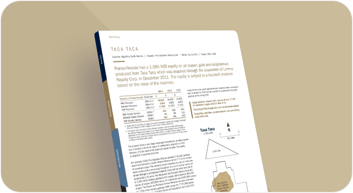 T A C A T A C A Location: Argentina, South America | Operator: First Quantum Minerals Ltd. | Metals: Cu, Au & Mo | Royalty: NSR: 1.08% Franco-Nevada has a 1.08% NSR royalty on all copper, gold and molybdenum produced from Taca Taca which was acquired through the acquisition of Lumina Royalty Corp. in December 2011. The royalty is subject to a buy-back provision based on the value of the reserves. 2024 2023 2022 Revenue to Franco-Nevada ($ million) $ − $ − $ – M&I Resource (Mlbs Cu)1 20,835 20,835 20,835 Inferred Resource (Mlbs Cu)1 4,863 4,863 4,863 P&P Reserves (Mlbs Cu)1 17,052 17,052 17,052 M&I Royalty Ounces (000s)1,2 356 368 490 Inferred Royalty Ounces (000s)2 81 86 112 P&P Royalty Ounces (000s)2 293 301 403 1 Please refer to the tables on pages 114-120 for a breakout of grade and tonnages by Mineral Resource category; all M&I categories are inclusive of Mineral Reserves 2 For Royalty Ounce calculation, Franco-Nevada estimates 100% of the Mineral Resources and Mineral Reserves are subject to our royalty interest and estimates a rate of 0.918% is applicable for the copper Royalty Ounces (which factors in a NSR smelting charge of 15%). Copper has been converted to Royalty Ounces assuming $4.25 per pound ($3.75 per pound in 2023, $4.00 per pound in 2022) The property hosts a very large copper-gold-molybdenum porphyry system and is located in the Puna region of northwestern Argentina in Salta Province, 230 km west of the provincial capital of Salta. The royalty is subject to a buy-back provision. In November 2020, First Quantum filed an updated NI 43-101 technical report and declared a maiden Mineral Reserve of over 7.7 million tonnes of contained copper. The technical report considers an open pit mine plan which contemplates processing throughput of up to 60 million tonnes per annum through a conventional flotation circuit with an initial mine life of approximately 32 years. The Measured and Indicated Mineral Resource is 2,203 million tonnes, grading 0.43% copper, and contains 9,451,000 tonnes of copper, 265,000 tonnes of molybdenum and 6,052,000 ounces of gold. The Proven and Probable Mineral Reserve has been estimated at 1,759 million tonnes, grading 0.44% copper, for 7,735,000 tonnes of contained copper, 214,000 tonnes of molybdenum and 5,087,000 ounces of gold. The 2024 Argentinian incentive regime for large investments (Régimen de Incentivo para Grandes Inversiones or RIGI) has a two-year window to apply. The legislation provides special foreign exchange provisions and tax and customs incentives, focusing on predictability, stability, and legal certainty across various sectors, including mining. First Quantum is currently preparing an update of the NI 43-101 Technical Report and plans to submit an application for the RIGI regime. First Quantum is also continuing with the project pre-development and feasibility activities. The project’s primary Environmental and Social Impact Assessment (“ESIA”) continues to be under evaluation by the Secretariat of Mining of Salta Province. Key milestones such as an independent evaluation from SEGEMAR (Argentinian Geological and Mining Service) were completed during the fourth quarter of 2024, which included a workshop and site visit. Following a decision on the ESIA, subsequent proceedings for detailed construction and operation permits will continue. A pre-feasibility ESIA was submitted in 2021 for a bypass and access road construction which approval is underway. The environmental aspects for a 345 kilovolts power line development was approved in 2022, and First Quantum is advancing additional technical aspects required for the ESIA. The project will also require approval of concessions for borefield water supply for the mine, which applications for industrial water concessions were submitted in 2023 and are expected to be granted following the approval of the mining ESIA. Taca Taca 1.08% NSR kilometer 5 0 N First Quantum 2020 Technical Report Ultimate Pit Design N Arica Iquique Antofagasta La Serena Copiapo NuevaUnión (Relincho) Peru Argentina Taca Taca Pacifc Ocean Royalty Area 1.08% NSR 1.08% NSR Large porphyry deposit with reserve of over 7.7 Mt of contained copper and 5.1 Moz of Au Potentially First Quantum’s next development project Feasibility activities, pre-development and permitting work underway TSX / NYSE: FNV 92 ★ Franco-Nevada Corporation Other Mining Overview Precious Metals Diversified Assets