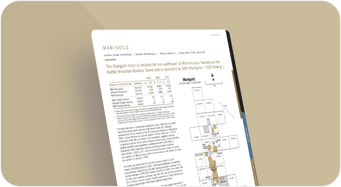 M A R I G O L D Location: Nevada, United States | Operator: SSR Mining Inc. | Precious Metals: Au | Royalty: NSR: 1.75-5% / GR: 0.5-4% The Marigold mine is located 64 km southeast of Winnemucca, Nevada on the Battle Mountain-Eureka Trend and is operated by SSR Mining Inc. (“SSR Mining”). 2024 2023 2022 Revenue to Franco-Nevada ($ million) $ 6.5 $ 11.2 $ 7.5 M&I Resources (koz Au)1 5,166 4,603 5,004 Inferred Resources (koz Au)1 249 370 252 P&P Reserves (koz Au)1 3,256 2,863 3,410 M&I Royalty Ounces (000s)1,2 95 113 126 Inferred Royalty Ounces (000s)2 5 9 6 P&P Royalty Ounces (000s)2 60 70 86 1 Please refer to the tables on pages 114-120 for a breakout of grade and tonnages by Mineral Resource category; all M&I categories are inclusive of Mineral Reserves 2 For Royalty Ounce calculation, Franco-Nevada estimates 81% of the Mineral Reserves (96% in 2023, 97% in 2022), 81% of the M&I Mineral Resources (96% in 2023, 96% in 2022) and 81% of the Inferred Mineral Resources (96% in 2023, 97% in 2022) are subject to our royalty interest and estimates a rate of 2.28% is applicable (2.55% in 2023, 2.59% in 2022) The mine has been in continuous production since 1989 and is a large run-of-mine heap leach operation with several open pits. Marigold achieved 5.0 million ounces of life of mine gold production in December 2024. Franco-Nevada has various royalties on the operation (1.75-5% NSR and 0.5-4% GR), as shown in the schematic, together covering a significant portion of the current Mineral Reserve base. Franco-Nevada’s original royalties were acquired in connection with its IPO and, in December 2009, additional royalties covering alternate sections were added. In 2024, 27.7 million tonnes of ore were placed on pads at a grade of 0.28 g/t versus 21.9 million tonnes of ore placed on pads at a grade of 0.45 g/t in 2023. The mine had production of 168,262 ounces of gold in 2024 versus 278,488 ounces in 2023. 2025 gold production is expected to be between 160,000 to 190,000 ounces and then increase to an annual average of 250,000 ounces for 2026 to 2029. The current life of mine plan predicts an 8-year mine life, with life of mine production of 2.0 million ounces of gold. Royalty payments to Franco-Nevada will fluctuate depending on the royalty ground being mined. SSR Mining’s strategy to advance brownfields targets proximal to existing infrastructure continues to yield encouraging results and the company plans to continue its exploration drilling in 2025 with a $22 million budget. The focus will be on oxide mineral reserve additions and conversion at Buffalo Valley, Mackay, Valmy and New Millenium. Franco-Nevada royalty ground covers Mackay and portions of the Valmy and New Millenium targets. Valmy Buffalo Valley and Trenton Canyon to the south. No FNV Royalty 5 North Pits 8 North Pit 8 South New Millenium Basalt & Antler Terry Zone North Terry Zone 1.75% NSR 1.75% NSR 1.75% NSR 1.75% NSR 5% NSR 5% NSR 5% NSR 5% NSR 5% NSR 5% NSR 5% NSR 5% NSR 5% NSR 5% NSR 5% NSR 5% NSR 3% NSR* 3% NSR* 3% NSR* 2.5%-4% GR* 2.5%-4% GR* 2.5%-4% GR* 2.5%-4% GR* 5% NSR 1.75% NSR Schematic Representation Only Valmy Mud Pits Red Dot Target Pit 2.5%- 4% GR* 0.5%-1.5% GR* Mackay Pit Marigold 1.75-5% NSR / 0.5-4% GR mile 1 0 Marigold Pacifc Ocean Oregon Idaho Utah Nevada California Arizona MEXICO FNV Royalties Excluded from Royalty Pits * December 2009 Acquisition N 5 Moz of life of mine gold production achieved in 2024 Continued resource expansion and encouraging exploration results Franco-Nevada Corporation ★ 65 TSX / NYSE: FNV United States Additional Information Mineral Resources and Mineral Reserves Diversified Assets