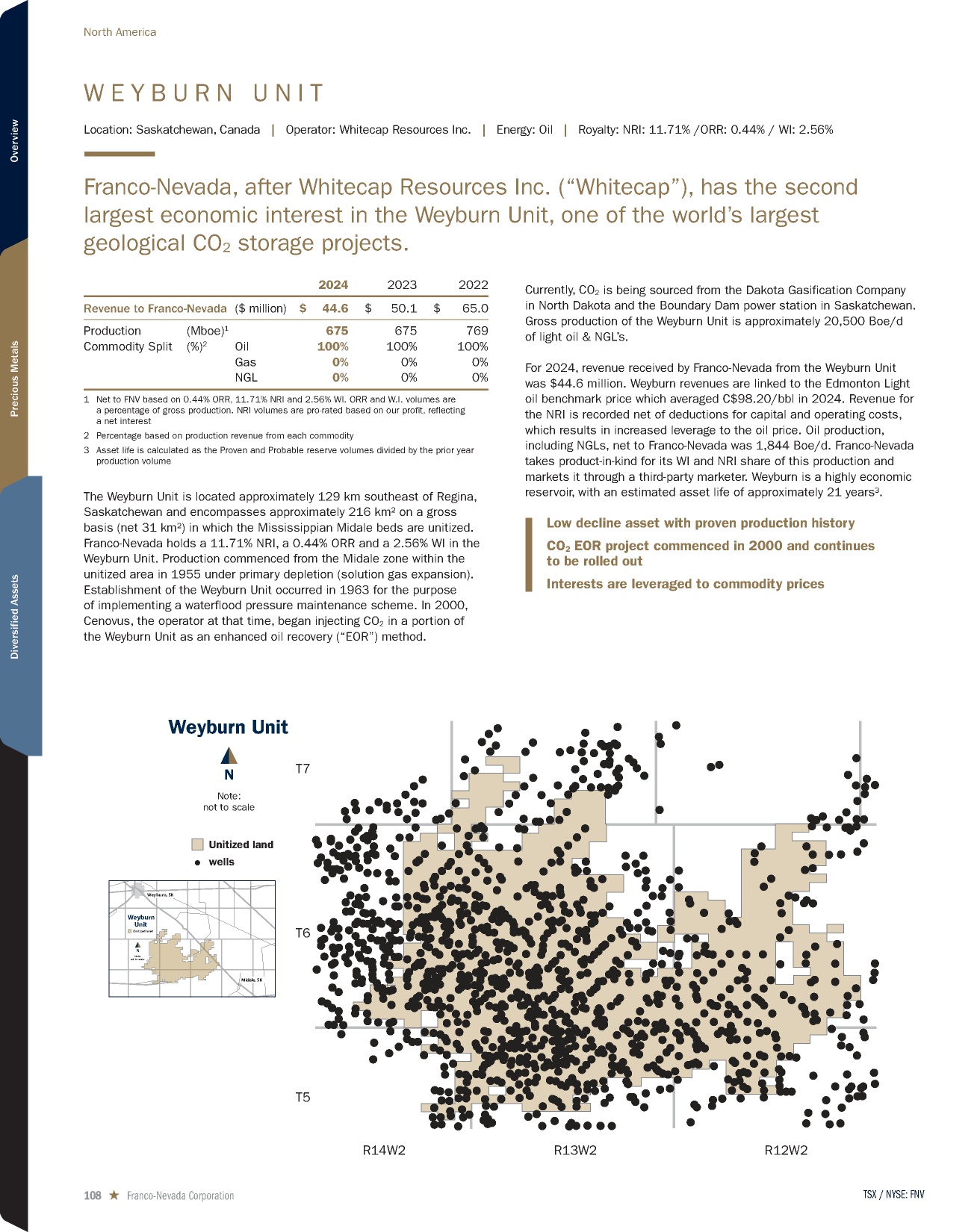 W E Y B U R N U N I T Location: Saskatchewan, Canada | Operator: Whitecap Resources Inc. | Energy: Oil | Royalty: NRI: 11.71% /ORR: 0.44% / WI: 2.56% Franco-Nevada, after Whitecap Resources Inc. (“Whitecap”), has the second largest economic interest in the Weyburn Unit, one of the world’s largest geological CO2 storage projects. 2024 2023 2022 Revenue to Franco-Nevada ($ million) $ 44.6 $ 50.1 $ 65.0 Production (Mboe)1 675 675 769 Commodity Split (%)2 Oil 100% 100% 100% Gas 0% 0% 0% NGL 0% 0% 0% 1 Net to FNV based on 0.44% ORR, 11.71% NRI and 2.56% WI. ORR and W.I. volumes are a percentage of gross production. NRI volumes are pro-rated based on our profit, reflecting a net interest 2 Percentage based on production revenue from each commodity 3 Asset life is calculated as the Proven and Probable reserve volumes divided by the prior year production volume The Weyburn Unit is located approximately 129 km southeast of Regina, Saskatchewan and encompasses approximately 216 km2 on a gross basis (net 31 km2) in which the Mississippian Midale beds are unitized. Franco-Nevada holds a 11.71% NRI, a 0.44% ORR and a 2.56% WI in the Weyburn Unit. Production commenced from the Midale zone within the unitized area in 1955 under primary depletion (solution gas expansion). Establishment of the Weyburn Unit occurred in 1963 for the purpose of implementing a waterflood pressure maintenance scheme. In 2000, Cenovus, the operator at that time, began injecting CO2 in a portion of the Weyburn Unit as an enhanced oil recovery (“EOR”) method. Currently, CO2 is being sourced from the Dakota Gasification Company in North Dakota and the Boundary Dam power station in Saskatchewan. Gross production of the Weyburn Unit is approximately 20,500 Boe/d of light oil & NGL’s. For 2024, revenue received by Franco-Nevada from the Weyburn Unit was $44.6 million. Weyburn revenues are linked to the Edmonton Light oil benchmark price which averaged C$98.20/bbl in 2024. Revenue for the NRI is recorded net of deductions for capital and operating costs, which results in increased leverage to the oil price. Oil production, including NGLs, net to Franco-Nevada was 1,844 Boe/d. Franco-Nevada takes product-in-kind for its WI and NRI share of this production and markets it through a third-party marketer. Weyburn is a highly economic reservoir, with an estimated asset life of approximately 21 years³. Weyburn Unit wells Unitized land Note: not to scale T7 T6 T5 R13W2 R12W2 R14W2 N Weyburn Unit Note: not to scale T9 T8 T7 T6 T5 T4 T3 T9 T8 T7 T6 T5 T4 T3 Weyburn, SK Unitized land Midale, SK N Low decline asset with proven production history CO2 EOR project commenced in 2000 and continues to be rolled out Interests are leveraged to commodity prices TSX / NYSE: FNV 108 ★ Franco-Nevada Corporation North America Overview Precious Metals Diversified Assets