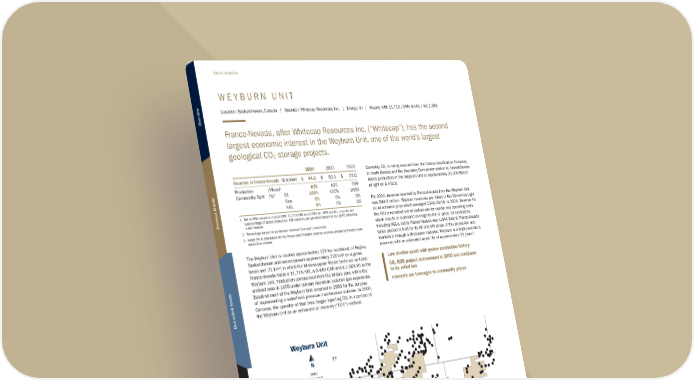 W E Y B U R N U N I T Location: Saskatchewan, Canada | Operator: Whitecap Resources Inc. | Energy: Oil | Royalty: NRI: 11.71% /ORR: 0.44% / WI: 2.56% Franco-Nevada, after Whitecap Resources Inc. (“Whitecap”), has the second largest economic interest in the Weyburn Unit, one of the world’s largest geological CO2 storage projects. 2024 2023 2022 Revenue to Franco-Nevada ($ million) $ 44.6 $ 50.1 $ 65.0 Production (Mboe)1 675 675 769 Commodity Split (%)2 Oil 100% 100% 100% Gas 0% 0% 0% NGL 0% 0% 0% 1 Net to FNV based on 0.44% ORR, 11.71% NRI and 2.56% WI. ORR and W.I. volumes are a percentage of gross production. NRI volumes are pro-rated based on our profit, reflecting a net interest 2 Percentage based on production revenue from each commodity 3 Asset life is calculated as the Proven and Probable reserve volumes divided by the prior year production volume The Weyburn Unit is located approximately 129 km southeast of Regina, Saskatchewan and encompasses approximately 216 km2 on a gross basis (net 31 km2) in which the Mississippian Midale beds are unitized. Franco-Nevada holds a 11.71% NRI, a 0.44% ORR and a 2.56% WI in the Weyburn Unit. Production commenced from the Midale zone within the unitized area in 1955 under primary depletion (solution gas expansion). Establishment of the Weyburn Unit occurred in 1963 for the purpose of implementing a waterflood pressure maintenance scheme. In 2000, Cenovus, the operator at that time, began injecting CO2 in a portion of the Weyburn Unit as an enhanced oil recovery (“EOR”) method. Currently, CO2 is being sourced from the Dakota Gasification Company in North Dakota and the Boundary Dam power station in Saskatchewan. Gross production of the Weyburn Unit is approximately 20,500 Boe/d of light oil & NGL’s. For 2024, revenue received by Franco-Nevada from the Weyburn Unit was $44.6 million. Weyburn revenues are linked to the Edmonton Light oil benchmark price which averaged C$98.20/bbl in 2024. Revenue for the NRI is recorded net of deductions for capital and operating costs, which results in increased leverage to the oil price. Oil production, including NGLs, net to Franco-Nevada was 1,844 Boe/d. Franco-Nevada takes product-in-kind for its WI and NRI share of this production and markets it through a third-party marketer. Weyburn is a highly economic reservoir, with an estimated asset life of approximately 21 years³. Weyburn Unit wells Unitized land Note: not to scale T7 T6 T5 R13W2 R12W2 R14W2 N Weyburn Unit Note: not to scale T9 T8 T7 T6 T5 T4 T3 T9 T8 T7 T6 T5 T4 T3 Weyburn, SK Unitized land Midale, SK N Low decline asset with proven production history CO2 EOR project commenced in 2000 and continues to be rolled out Interests are leveraged to commodity prices TSX / NYSE: FNV 108 ★ Franco-Nevada Corporation North America Overview Precious Metals Diversified Assets