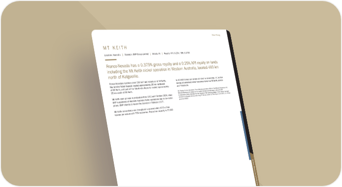 M T K E I T H Location: Australia | Operator: BHP Group Limited | Metals: Ni | Royalty: NPI: 0.25% / GR: 0.375% Franco-Nevada has a 0.375% gross royalty and a 0.25% NPI royalty on lands including the Mt Keith nickel operation in Western Australia, located 460 km north of Kalgoorlie. Franco-Nevada’s royalties cover 236 km2 and include all of Mt Keith, the Jericho Nickel deposit located approximately 25 km northwest of Mt Keith, and part of the Yakabindie deposits located approximately 25 km south of Mt Keith. Mt Keith open pit was in production from 1993 until October 2024, when BHP suspended all Western Australia Nickel operations due to low nickel prices. BHP intends to review the decision in February 2027. Mt Keith concentrator ore throughput is approximately 10.5 million tonnes per annum with 70% recoveries. Production capacity is 35,000 to 40,000 tonnes per annum of nickel in concentrate. 4.1 million tonnes of contained nickel resources remain at Mt Keith, Jericho and Yakabindie. For Royalty Ounce calculation, Franco-Nevada estimates 100% of the Mineral Resources and Mineral Reserves are subject to our royalty interest and estimates a rate of 0.50% is applicable. Franco-Nevada has also applied a NSR smelting charge of 30%. Nickel has been converted to Royalty Ounces assuming $7.89 per pound ($7.89 per pound in 2023, $11.00 per pound in 2022) Franco-Nevada Corporation ★ 99 TSX / NYSE: FNV Other Mining Additional Information Mineral Resources and Mineral Reserves