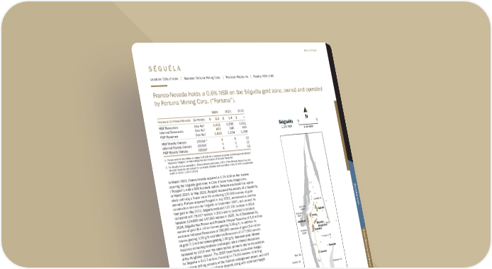 S É G U É L A Location: Côte d’Ivoire | Operator: Fortuna Mining Corp. | Precious Metals: Au | Royalty: NSR: 0.6% Franco-Nevada holds a 0.6% NSR on the Séguéla gold mine, owned and operated by Fortuna Mining Corp. (“Fortuna”). 2024 2023 2022 Revenue to Franco-Nevada ($ million) $ 2.2 $ 1.4 $ − M&I Resources (koz Au)1 1,412 1,535 1,611 Inferred Resources (koz Au)1 677 245 960 P&P Reserves (koz Au)1 1,016 1,154 1,088 M&I Royalty Ounces (000s)1,2 8 9 19 Inferred Royalty Ounces (000s)2 4 2 12 P&P Royalty Ounces (000s)2 6 7 13 1 Please refer to the tables on pages 114-120 for a breakout of grade and tonnages by Mineral Resource category; all M&I categories are inclusive of Mineral Reserves 2 For Royalty Ounce calculation, Franco-Nevada estimates 100% of the Mineral Resources and Mineral Reserves are subject to our royalty interest and estimates a rate of 0.6% is applicable (0.6% in 2023, 1.2% in 2022) In March 2021, Franco-Nevada acquired a 1.2% NSR on the license covering the Séguéla gold mine in Côte d’Ivoire from Roxgold Inc. (“Roxgold”), with a 50% buy-back option. Fortuna exercised this option in March 2024. In May 2021, Roxgold released the results of a feasibility study outlining a 9-year mine life producing 120,000 ounces of gold annually. Fortuna acquired Roxgold in July 2021, announced a positive construction decision for Séguéla in September 2021, and poured its first gold in May 2023. Séguéla produced 137,781 ounces in 2024 compared with 78,617 ounces in 2023 and is expected to produce between 134,000 and 147,000 ounces in 2025. As of December 31, 2024, Séguéla has Proven and Probable Mineral Reserves of 1.0 million ounces of gold (9.4 million tonnes grading 3.38 g/t), in addition to exclusive Indicated Resources of 396,000 ounces of gold (3.4 million tonnes grading 3.59 g/t) and Inferred Resources of 677,000 ounces of gold (7.3 million tonnes grading 2.90 g/t). Year-over-year, Mineral Reserves remaining relatively unchanged, while Inferred Resources increased by 121% over the same period, primarily due to the addition of the Kingfisher deposit. The 2025 brownfields exploration budget for Séguéla is $13.5 million, focusing on 73,000 meters of drilling to upgrade drilling primarily at the Sunbird underground project, and infill and expansion of the Kingfisher deposit, along with continued target generation, all on royalty ground. Séguéla 1.2% NSR kilometer 5 0 N Vincho UG Raul UG Ancien Agouti Boulder Winy Gabbro W Antenna South Antenna North Antenna West P1 Kwenko Siakasso N P7 P2 Kwenko W Koula Antenna Sunbird Schist Resource Pit Target Target Strat Séguéla NSR Area Pelite Kingfisher Kingfisher deposit maiden Inferred Resource adds 294k ounces Exploration upside on land package covered by royalty Franco-Nevada Corporation ★ 75 TSX / NYSE: FNV Rest of World Additional Information Mineral Resources and Mineral Reserves Diversified Assets