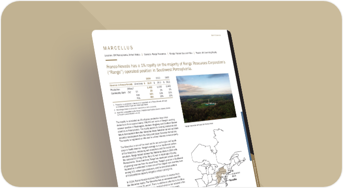 M A R C E L L U S Location: SW Pennsylvania, United States | Operator: Range Resources | Energy: Natural Gas and NGLs | Royalty: 1% Overriding Royalty Franco-Nevada has a 1% royalty on the majority of Range Resources Corporation’s (“Range”) operated position in Southwest Pennsylvania. 2024 2023 2022 Revenue to Franco-Nevada ($ million) $ 26.9 $ 28.0 $ 56.5 Production (Mboe)1 1,462 1,436 1,442 Commodity Split (%)2 Oil 2% 2% 5% Gas 63% 63% 66% NGL 35% 35% 29% 1 Production is referenced in barrels of oil equivalent net to Franco-Nevada, although is comprised mostly of gas and natural gas liquids 2 Percentage based on production revenue from each commodity 3 Asset life is calculated as the Proven, Probable and Possible reserve volumes divided by the prior year production volume The royalty is calculated as 1% of gross production less minor deductions from approximately 338,000 net acres of Range’s working interest position in Washington, Western Allegheny and Southern Beaver counties in Pennsylvania. The royalty applies to existing production and future development from the Marcellus shale formation as well as future potential development from the Utica and Upper Devonian formations. The royalty is registered on title and is a direct interest in real property. The Marcellus is one of the most prolific and active gas and liquids plays in North America. Range’s acreage is in a liquids-rich portion of the Marcellus, enhancing well economics and the overall cost structure. Range helped pioneer the Marcellus shale in 2004 with the successful drilling of the Renz #1 well in Washington County, Pennsylvania. Since that time, Range has developed a track record of growing reserves from its asset base. Range’s position in Southwest Appalachia is estimated to have one of the longest core inventory lives among U.S. natural gas producers, and its diversified portfolio of transportation capacity mitigates in-basin pricing risk. In 2024, Franco-Nevada received $26.9 million in revenue from the Marcellus royalty. The Marcellus has an estimated asset life of approximately 21 years3. There is additional potential in the Utica and Upper Devonian formations, most of which is not included in the above estimate, that may increase the longevity of the asset. Range Resources drill pad, SW Pennsylvania Appalachian Basin Marcellus Diverse exposure to natural gas and natural gas liquids Long-life asset with strong underlying economics Secure land title with exposure to undeveloped formations at depth Franco-Nevada Corporation ★ 105 TSX / NYSE: FNV North America Additional Information Mineral Resources and Mineral Reserves