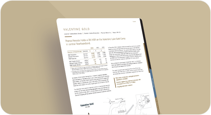 V A L E N T I N E G O L D Location: Newfoundland, Canada | Operator: Calibre Mining Corp. | Precious Metals: Au | Royalty: NSR: 3% Franco-Nevada holds a 3% NSR on the Valentine Lake Gold Camp in central Newfoundland. 2023 2023 2022 Revenue to Franco-Nevada ($ million) $ − $ − $ – M&I Resources (koz Au)1 3,955 3,955 3,960 Inferred Resources (koz Au)1 1,100 1,100 1,100 P&P Reserves (koz Au)1 2,700 2,700 2,690 M&I Royalty Ounces (000s)1,2 119 119 59 Inferred Royalty Ounces (000s)2 33 33 17 P&P Royalty Ounces (000s)2 81 81 40 1 Please refer to the tables on pages 114-120 for a breakout of grade and tonnages by Mineral Resource category; all M&I categories are inclusive of Mineral Reserves 2 For Royalty Ounce calculation, Franco-Nevada estimates 100% of the Mineral Resources and Mineral Reserves are subject to our royalty interest and estimates a rate of 3.0% is applicable (3.0% in 2023, 1.5% in 2022) In January 2024, Calibre Mining Corp. (“Calibre”) acquired Marathon Gold Corporation (“Marathon Gold”) and is now developing the Valentine Gold project. In February 2025, Equinox Gold announced a merger with Calibre, which is expected to close in Q2 2025. When completed, the Valentine Gold project will be the largest gold mine in Atlantic Canada. The Valentine Gold project comprises a series of mineralized deposits along a 32 km trend representing high grade open pits totalling 3.95 million ounces of M&I and 1.1 million ounces of Inferred Resources. Excellent ongoing drilling results indicate resource expansion potential. In December 2022, Marathon Gold announced the results of an updated feasibility study outlining a three-pit mine plan based on the Marathon, Leprechaun and Berry deposits. The updated study outlines a 14.3-year mine life, with an average gold production profile of 195,000 ounces of gold per year between 2025 and 2036 from the processing of high-grade mill feed, and 97,000 ounces of gold per year between 2037 and 2039 from the processing of low-grade stockpiles. M&I Resources, exclusive of reserves, contain an additional 1.27 million ounces. Mine construction commenced in September 2022. As of February 2025, the Valentine Gold project was nearing construction completion with first gold pour targeted for mid-2025. The current resources are hosted over 8 km of the 32 km long Valentine Lake Shear Zone. In 2024, Calibre discovered extensions of mineralization a further 1,000 meters long trend, the “Frank Zone”. Valentine Gold Property Teck Resources Duck Pond Mine Millertown Buchans Buchans Junction Deer Lake Corner Brook Springdale Grand Falls Badger Stephenville Buchans Millertown Duck Pond Mine Granite Canal Substation Valentine Lake Thrust Fault Marathon Deposit Leprechaun Deposit Victory Deposit Sprite Deposit Frank Zone Powerline Granite Canal Hydro Facility Berry Zone Quebec Ontario Valentine Gold Newfoundland Valentine Gold 3% NSR kilometer 20 0 N Marathon Gold Corporation N kilometer 0 75 Mine under construction with gold production expected in mid-2025 Detailed engineering underway to increase mill throughput from 4 Mtpa to +5 Mtpa Ongoing exploration success Franco-Nevada Corporation ★ 53 TSX / NYSE: FNV Canada Additional Information Mineral Resources and Mineral Reserves Diversified Assets